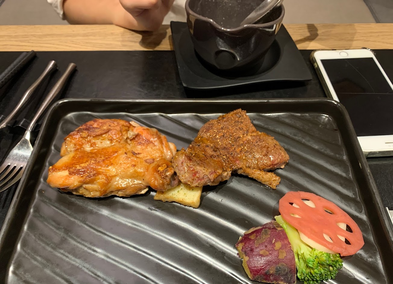 5分熟的瓦片牛排Q到爆,非常奇特的口感,吃起來不像一般牛肉;沙朗牛排本身沒什麼調味,筋多肥肉多;番茄湯和茶碗蒸裡的小干貝很柴;其他都沒什麼特別好吃的,不會考慮回訪。