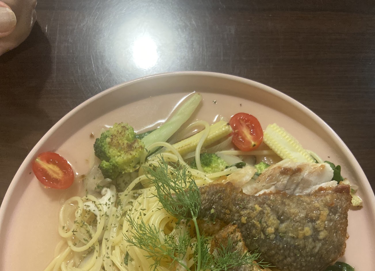 我點了紅醬鱸魚義大利麵 鱸魚皮煎的香香脆脆的 魚肉肉質軟嫩鮮甜 很好吃!!