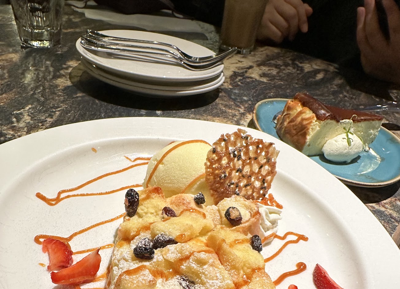 這天我們點比薩三重奏、以及特選安格斯嫩肩牛排。比薩是薄脆的餅皮,起司不多但三種調味都好吃;牛排應該是先舒肥過再上鐵板煎,切開粉紅不帶血,口感處理得不錯,一旁附的辣牛汁醬我很喜歡,沾牛排、蔬菜、或是佛卡夏都很搭。每次來我們都喜歡他的現榨果汁,搭配套餐加購再來個兩塊蛋糕,走出店門時肚子總是鼓鼓的。