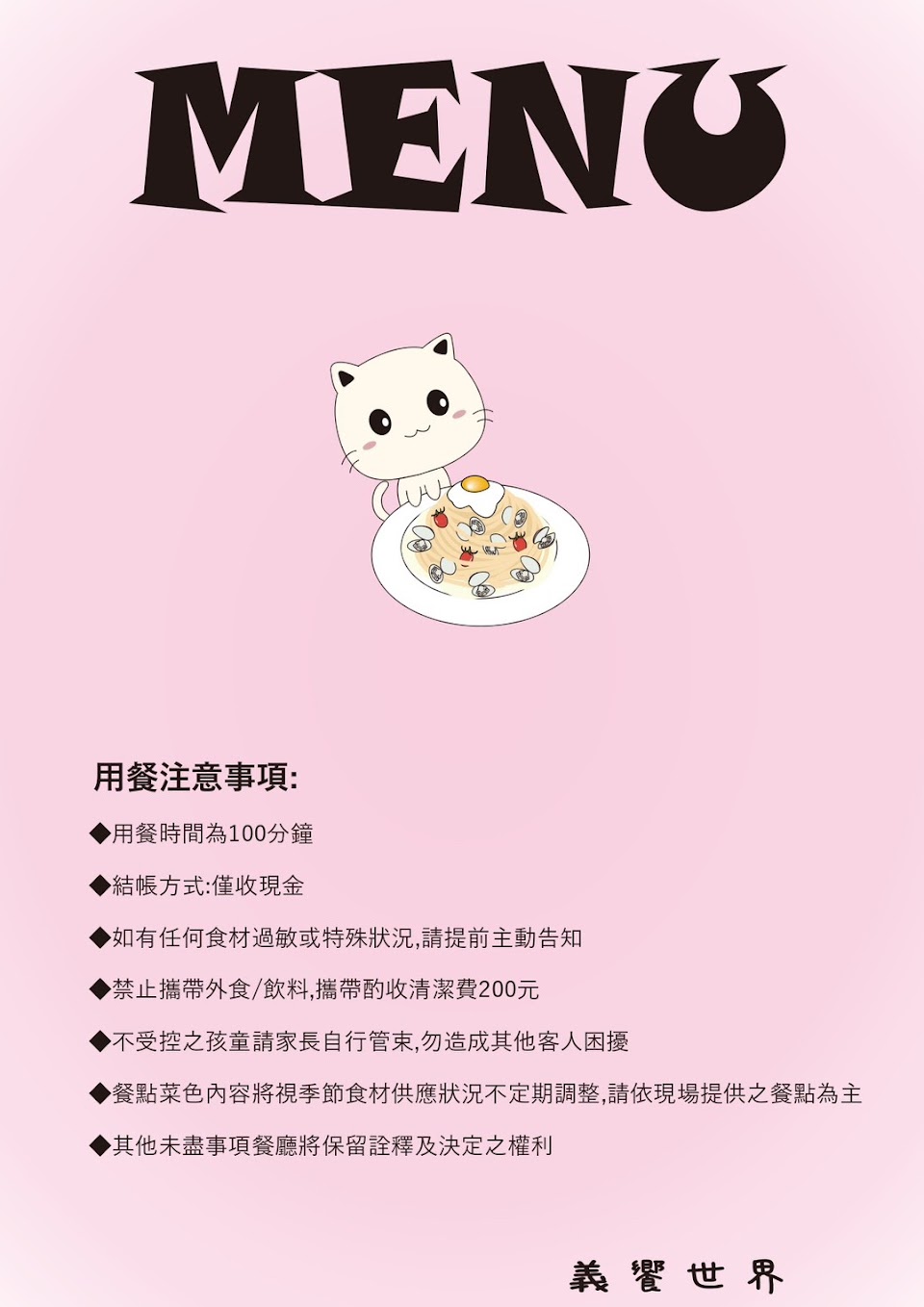 2024最新在地推薦餐廳的菜單_義饗世界— 義大利麵料理|推薦貓咪友善|網美必吃餐廳|公司商業午餐|平價包場活動|家庭親子聚餐|甜點下午茶|新埔捷運站|的菜單、圖片