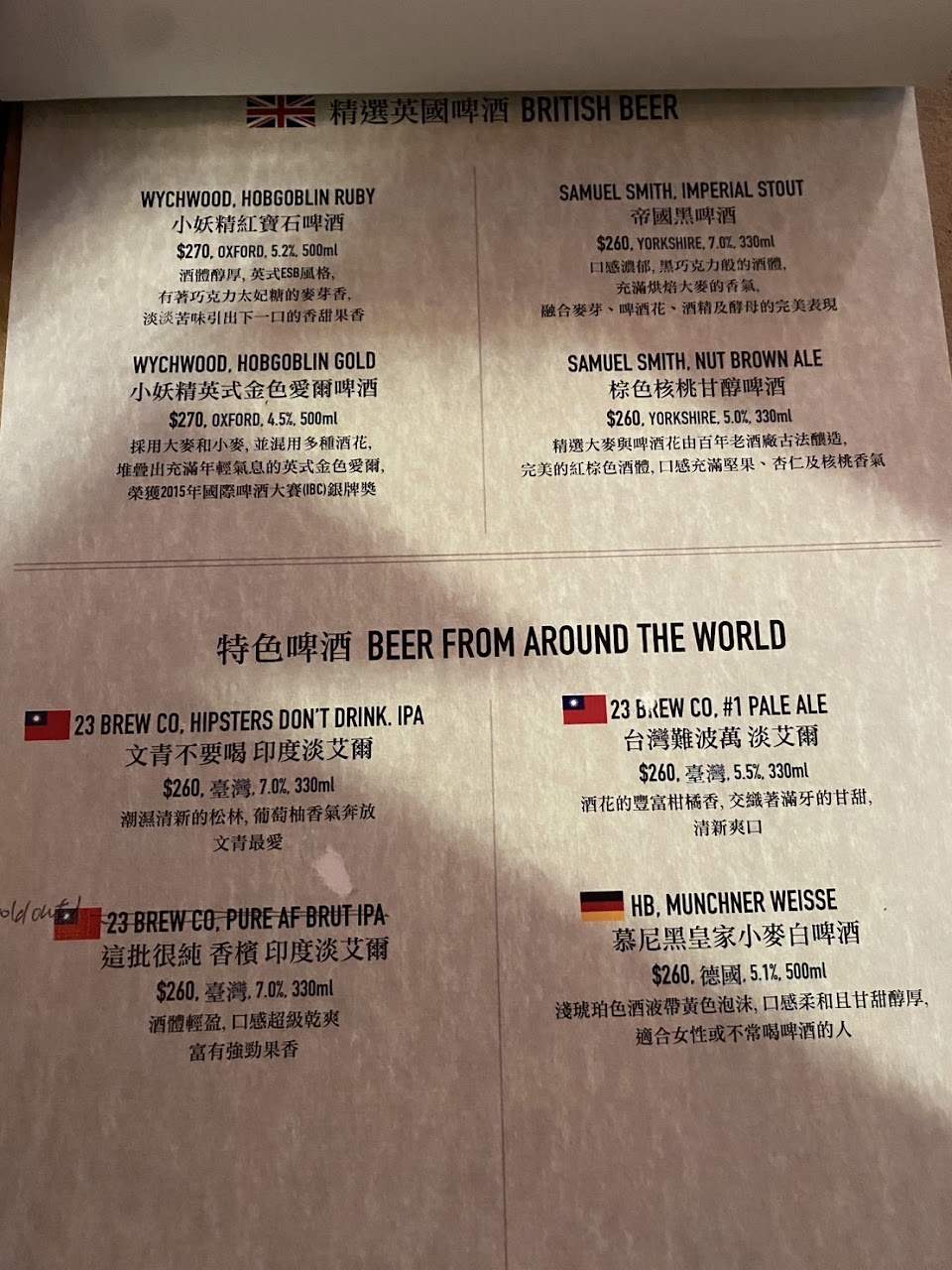 酒單用原子筆劃掉沒有庫存
