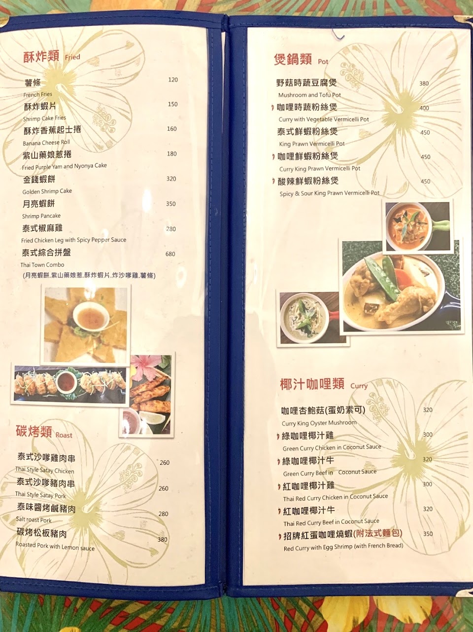 八里的老餐廳,應該開了有十年第一次進去吃,基本上氣氛營造不錯,服務也很好,可是菜蠻鹹的,口味比較台式,而且我覺得沒有一道菜我覺得好吃。椒麻雞不知為何有點苦味,然後打拋諸的口味是我吃過最特殊的。青菜跟綠咖哩雞就一般,不過綠咖哩還是味道稍稀了一點。加上一份排骨湯這樣大約1500多,加一成1700多。