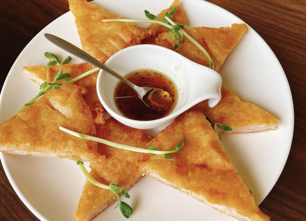 小島的月亮蝦餅真的是我目前吃過泰料中最用心最好吃的,外層米皮炸的脆脆的,內餡有滿滿的蝦肉(不是剁碎的是一塊一塊蝦肉)中間的那小碗醬料酸甜滋味,是這般蝦餅的靈魂啊,好想知道醬怎麼用出來的,回家炸雞塊沾一定很讚啊!!!心情好都會想來小島吃一盤月亮蝦餅,讓心情更好!店員的服務也都非常親切,美中不足的是,如果可以更新一下餐具,盤子、湯匙、碗的配色再鮮豔一點可能會更有食慾,來八里一定要吃小島啦!!!