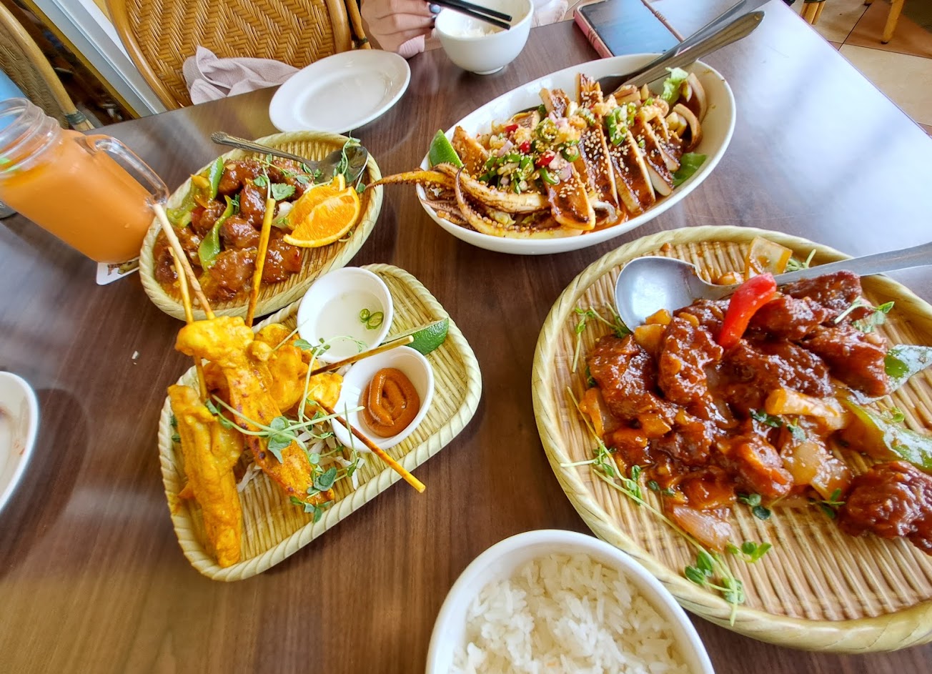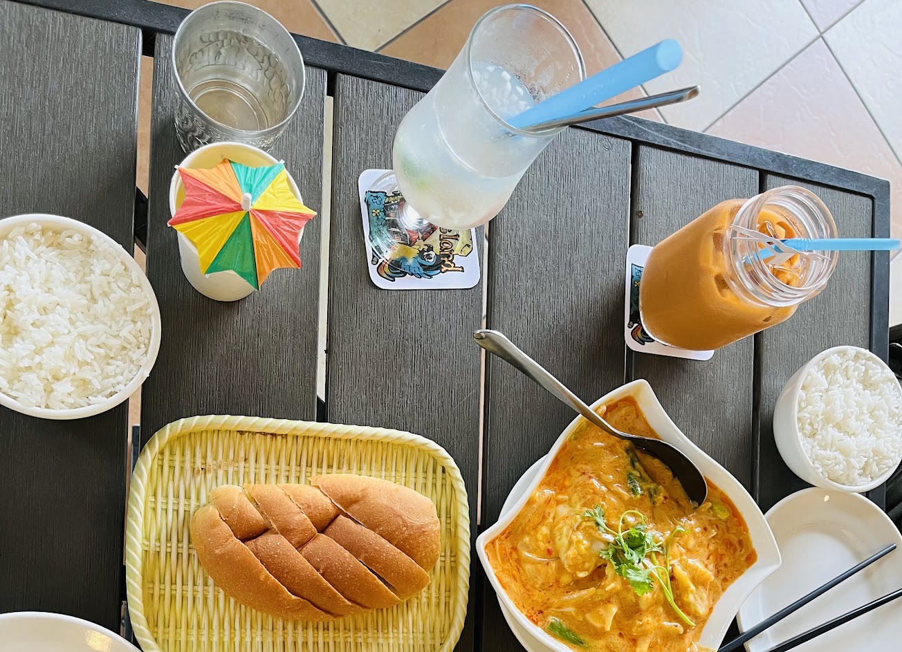 飲料水果茶好喝、蝦醬空心菜新鮮但是蝦醬味道我不喜歡,月亮蝦餅太厚口感就一般、咖哩紅蛋豬肉多滑蛋嫩但是咖哩味道太淡,可能拿來跟瓦城比較就比較一般…但是服務人員都非常貼心