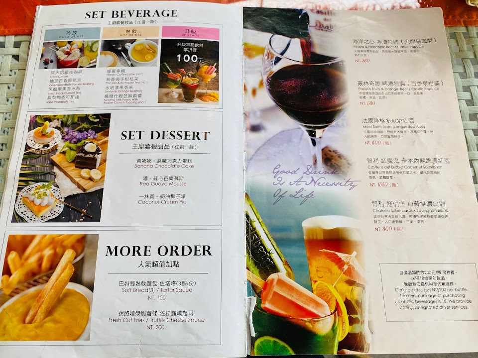 套餐中的湯品尚可,麵包搭配塔塔醬很好吃,點套餐可以免費再續一次麵包,主餐整體有一定的表現,沒特別驚艷表現中規中矩,服務人員態度也不錯,包廂表現也不錯(但沒包廂就覺得CP值沒那麼高?)在包廂裡很放鬆,真的有回到峇里島的那種放鬆感(但包廂有低消,大的包廂正常用餐時間低消是6000元/下午茶3000元),表現比較尚可的部份是套餐檢附的飲料及大廳還有整體內裝,感覺沒有1000元左右餐點價格的表現,其他整體都是不錯的,想放鬆很適合來這裡有一個偽峇里島的放鬆感。