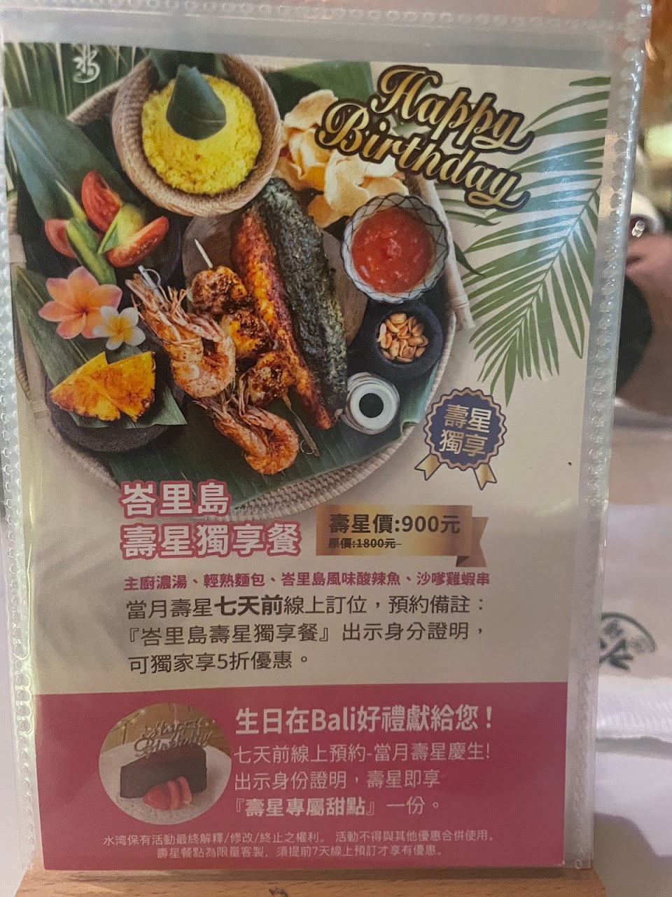飲食部分因為已去過另外相同的分店,建議可以有時請主廚更換新的菜色會更增加用餐的回流度。餐廳的服務生服務也非常用心,喜歡峇里島氣氛的人可以來此,值得再次過去。
