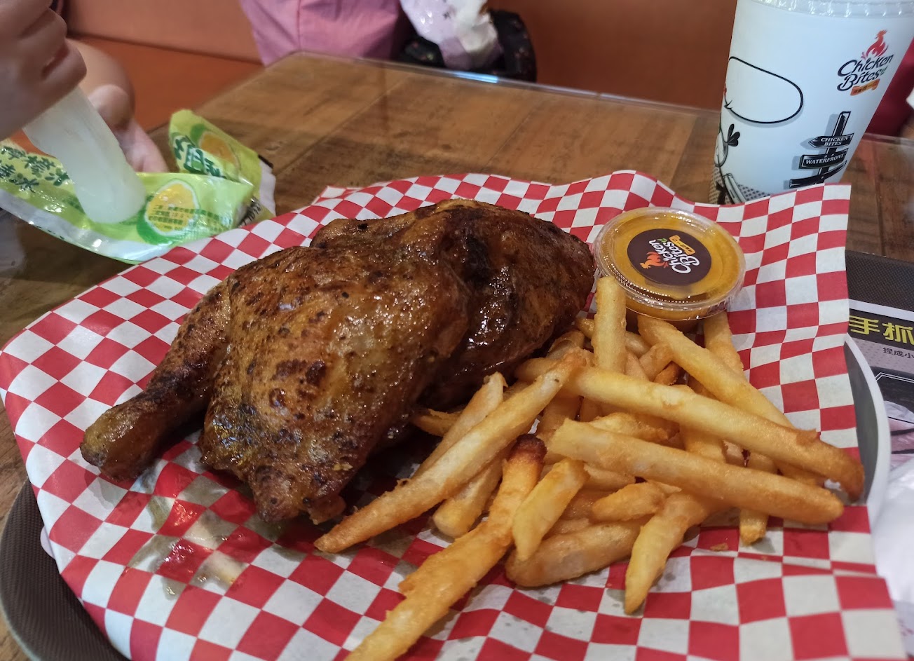 點了一隻半雞,去領回的餐只有薯條而已,說之後會補半隻雞再請我們過去領,結果比我們晚來的客人紛紛都領到自己的餐(也跟我們一樣,先領到的都是點心類,也說後來再叫號過去領點的雞,結果比我們晚來的客人全都比我們先領到。)