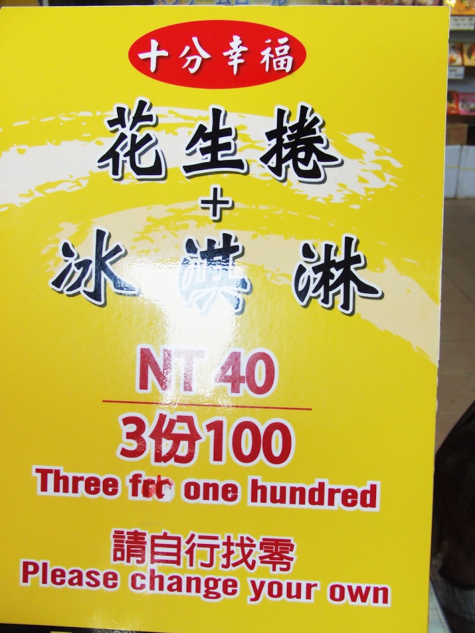 本來不愛吃花生捲冰淇淋的我,吃過「十分幸福花生捲冰淇淋」,才發現原來真是美味,而且老闆人帥心好,使用的食材都很天然,一邊享用美食一邊賞心悅目,銅板的價格,心情愉悅的氛圍,真是人生一大享受~大推??