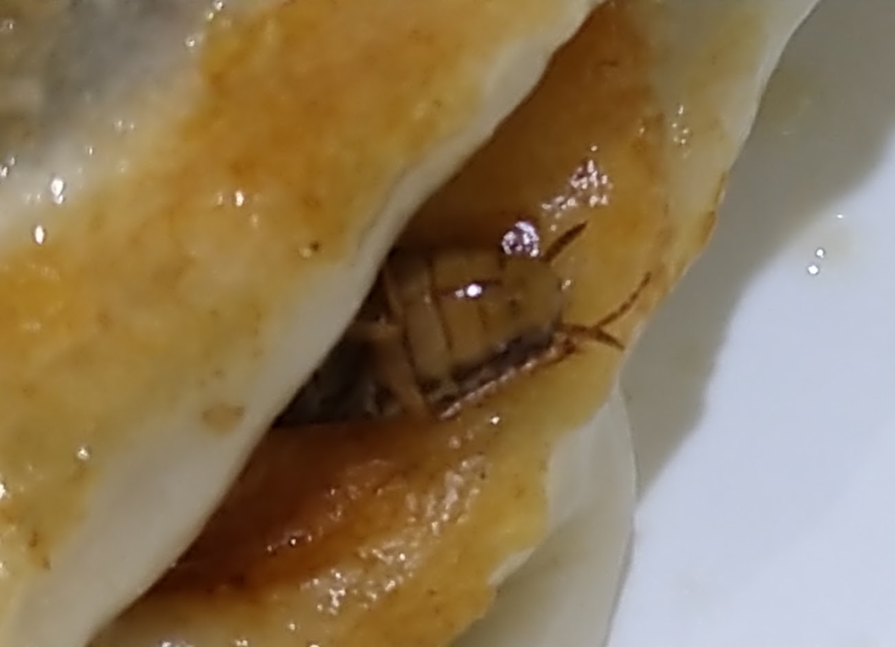 吃到快完了,鍋貼中夾隻大蟑螂,店家裝盒的時候都沒看到嗎