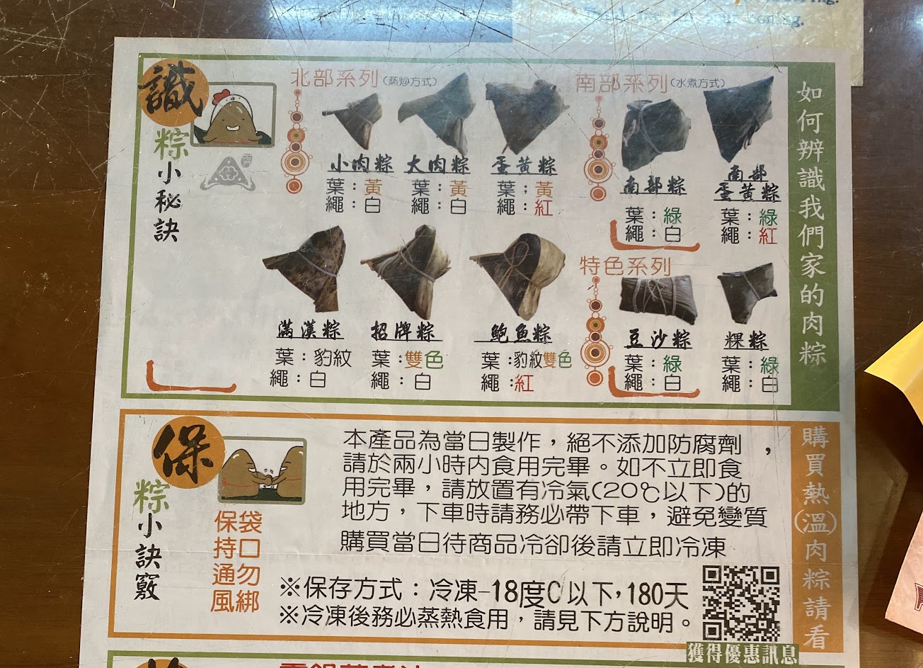 店員熱情有禮,選購了北部大肉粽、小肉粽、南部蛋黃粽,個人還是偏好南部粽,北部粽的餡料太乾,瘦肉過柴,南部粽口感香嫩滑順,餡料豐富,有機會會再來品嚐。