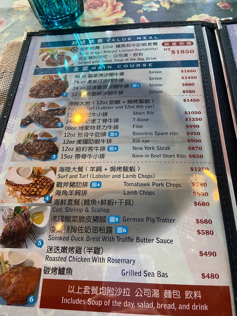牛排比臉還大,價格公道,肉質鮮美;羊排、開胃菜、湯、沙拉也都好吃!