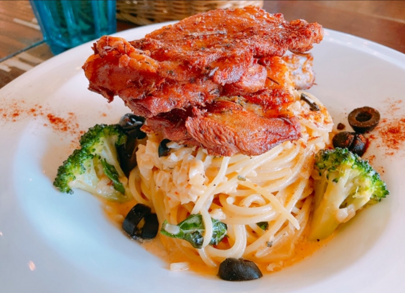義大利麵的炸雞腿肉汁、肉質超棒?