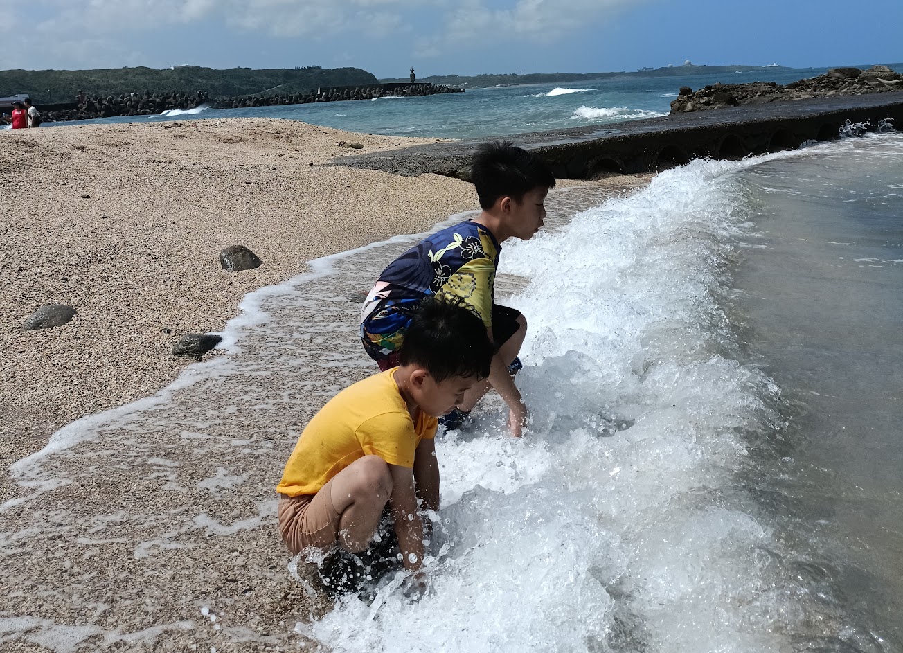 雖沒遇上退潮,沒有潮間帶可觀察海洋生物,但是光是在海邊感受海水的拍打就很享受了,體驗不同的悠閑,沖洗時鞋子及口袋中都是貝殼砂,孩子興奮的說那是他得到的寶藏。若要玩潮間帶建議先上網查看潮汐時間。
