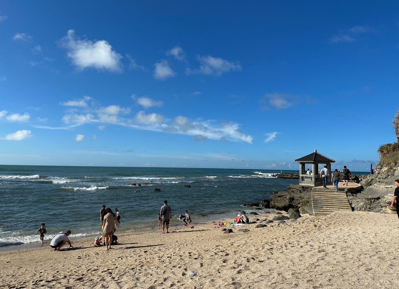 貝殼砂灘,看海天一線、賞藻礁、抓螃蟹,有廁所、休息區旁有商家賣烤香腸飲料。