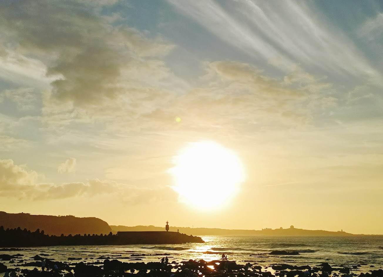 這裡的夕陽天氣好的時候真的非常的美,周邊的石門洞旁佈滿的砂石,大石頭是砂石與走到之間的灰色空間;海平面交織著遠方的雲彩,顯現出一種最屬於晚霞的美好且夢幻的顏色。