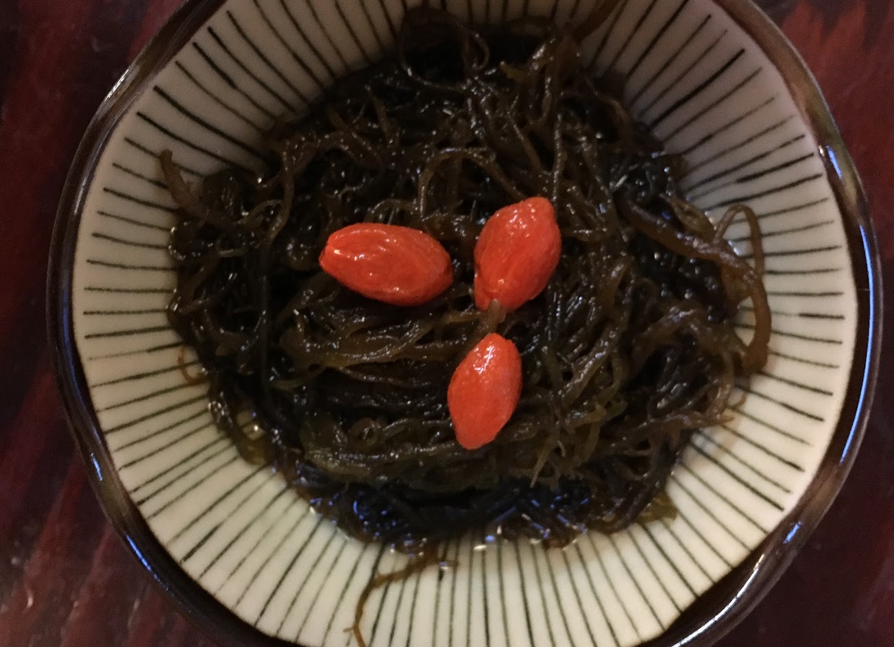 還沒進去就看到旺來在顧門 旺來是他們養的狗 另一隻自己來的叫肌肉(英語) 兩隻很可愛的狗在門口 看到我們來很熱情的一直打招呼 超可愛 我們一進去都覺得這間餐廳很日式風格 真的是在這段海鮮餐廳街中最獨一無二的地方 還有老老闆親切地跟我們解說 兩隻狗的由來 這位老老闆真的很親切 而老闆跟老闆娘也都親切地招呼 讓人第一印象很好 還有免費又好喝的麥茶 通常免費的麥茶都不好喝 但這間不會喔 麥茶好喝有味道 之前聽朋友說這間很好吃 也估狗過評價 果然名不虛傳 那天點的東西讓我印象最深刻的就是海葡萄丼飯 吃起來口感超好 只是價格有點偏高 但說實在 說高又不算真的高 因為東西獨特 外面沒吃過這種丼飯 而且還有小菜、湯、甜點跟飲料 所以一份套餐400多 說貴也還好啦!我覺得這間的東西 屬於精緻類型 若想要吃個特別的 來這邊就對了 還有焦糖布丁超讚! 除了套餐 我們還點了九孔藥膳湯 這道菜也好吃 藥味不會很苦 配上新鮮九孔 真的特別 還有很多特別的餐點 讓人吃了難以忘懷 回家順道帶一些九孔回家 老闆娘還貼心的準備海菜給九孔吃 好玩的是 那些海菜也可以煮湯喝 好特別 老闆娘說 他們的九孔都自己養的 幾天就換一次水 所以內臟可以吃 聽說內臟吃了對眼睛好 所以 有想要顧目瞅的朋友可以來試看看 最後大推海葡萄丼飯套餐!