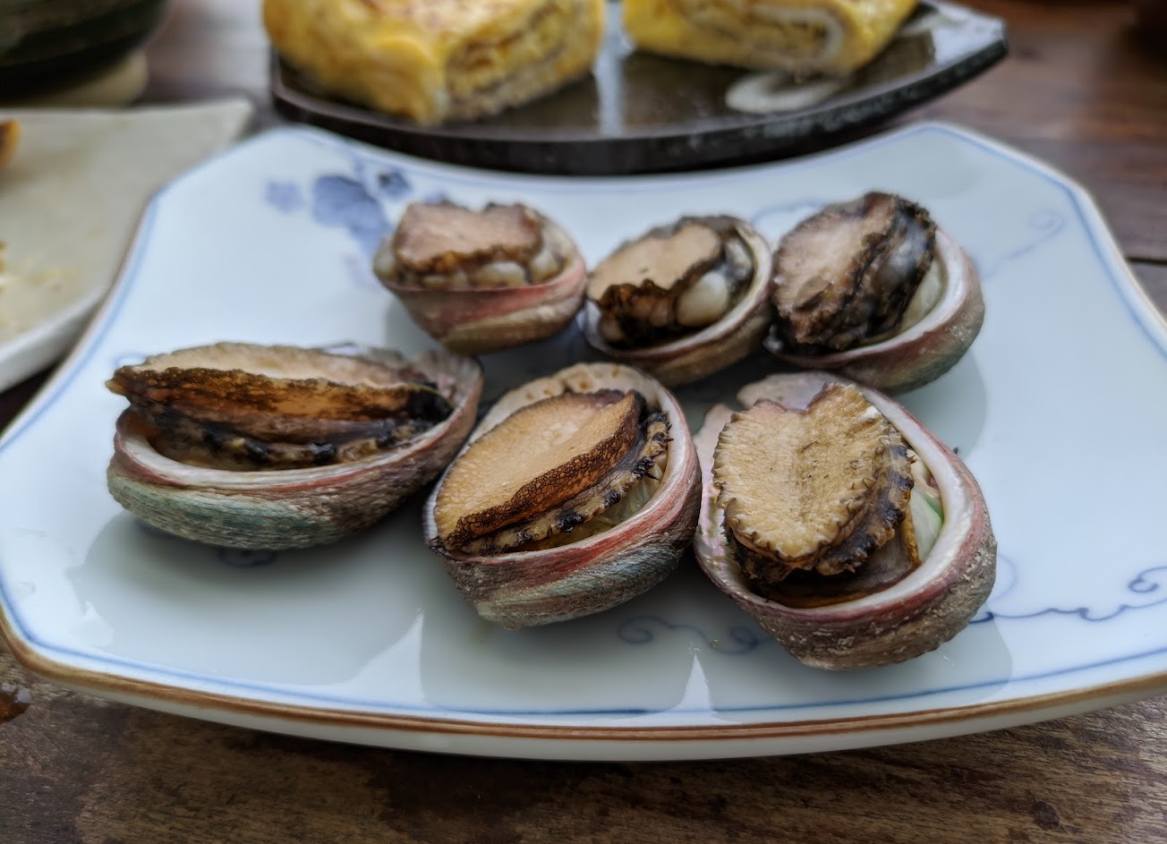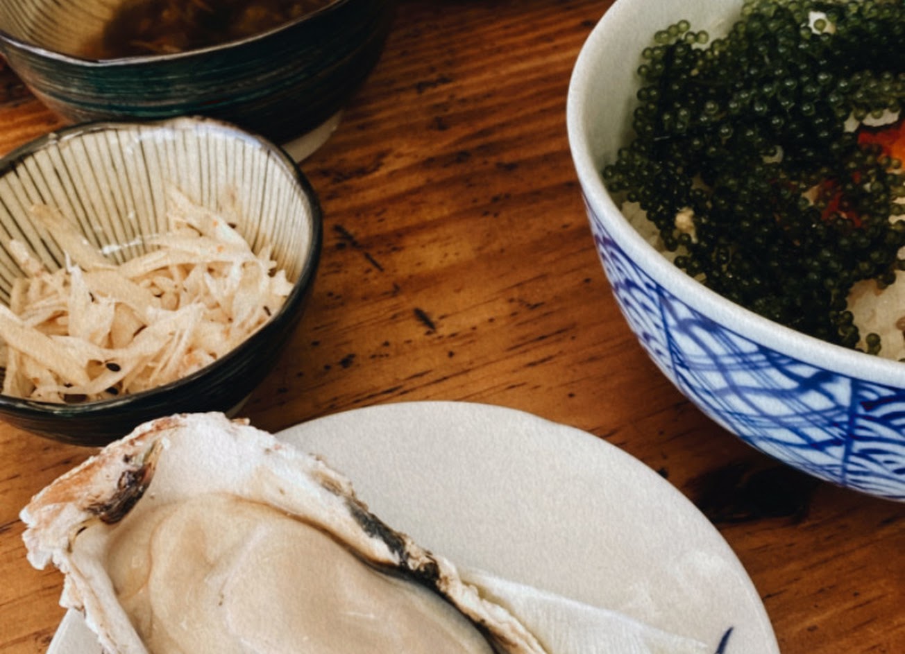 我們入境隨俗,點了最熱門的海葡萄丼飯、蟹肉沙拉、鹽燒九孔、海膽玉子燒,最後還加點了一隻蝦蛄,號稱小龍蝦,肉質比龍蝦還好吃。不誇張,除了沙拉以外,幾乎每一口下去,大海的味道盈滿鼻腔,沒有多做調味因此味道格外的鮮。