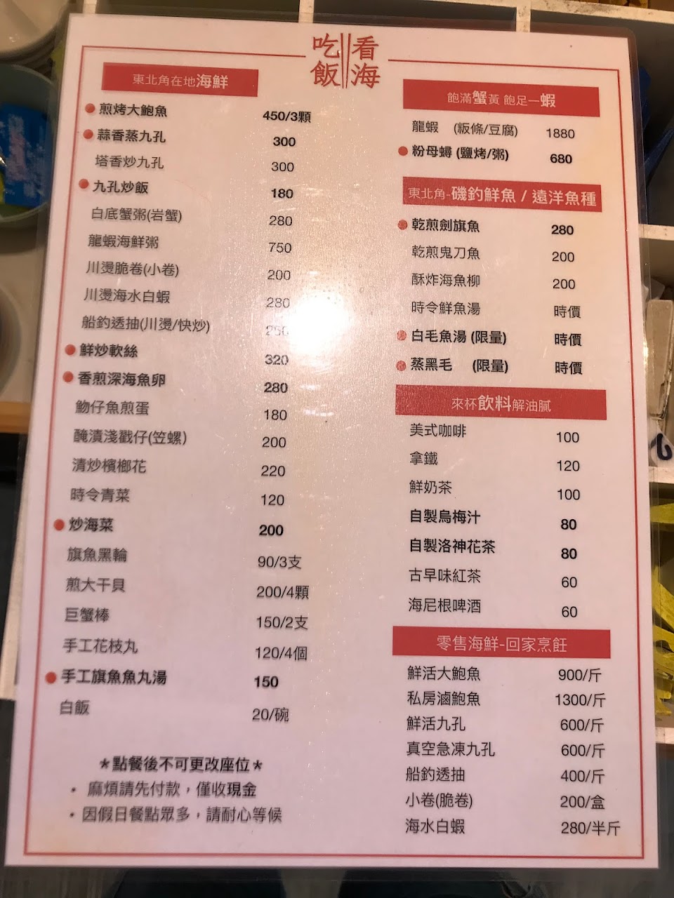 餐廳環境和東北角其他海鮮餐廳相比,算是乾淨明亮,不過桌數不多,建議先訂位或造訪前打電話詢問候位狀況。菜單選擇品項不多,東西味道算是好吃,不過餐點份量不多,如果期待高CP值,個人覺得附近的朋派咖啡平價海鮮不錯,可以試試。