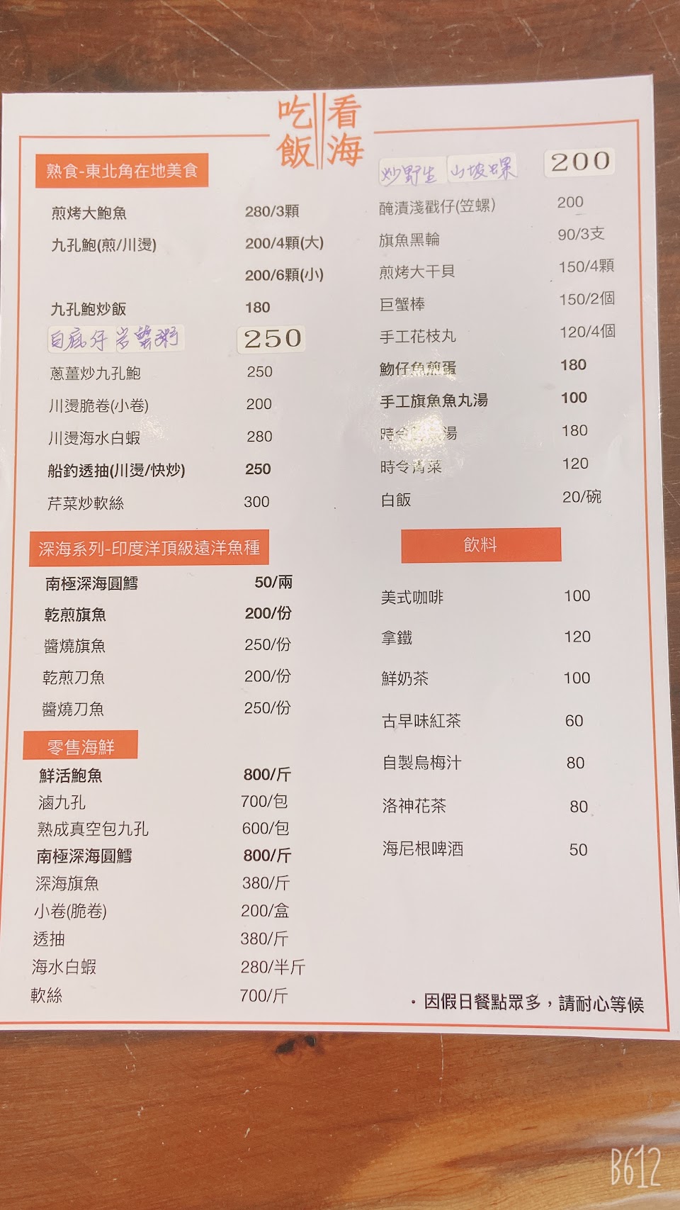 海景桌窗邊就可以看的海,很值得等待,每人低消2道菜,海鮮調味淡淡的,很新鮮很好吃 服務 內用 餐點類型 午餐 平均每人消費金額 $200-400 餐點:5 服務:5 氣氛:5 建議的餐點 旗魚黑輪, 九孔鮑炒飯
