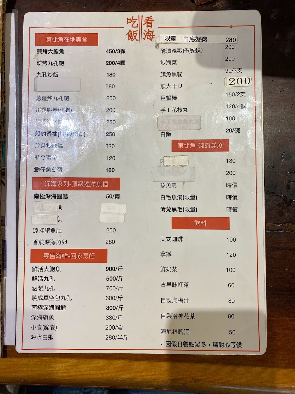 就好像身在一個小漁村裡 在普通不過的平常日很悠哉的看著海 吃著沒有華麗擺盤但海鮮很新鮮的家常便飯 這裡有很多九孔池 所以九孔鮑魚一定要點喔超新鮮 服務 內用 餐點類型 午餐 平均每人消費金額 $600-800 餐點:5 服務:5 氣氛:5 建議的餐點 川燙海水白蝦, 蒜香蒸九孔, 石蟹粥 香濃