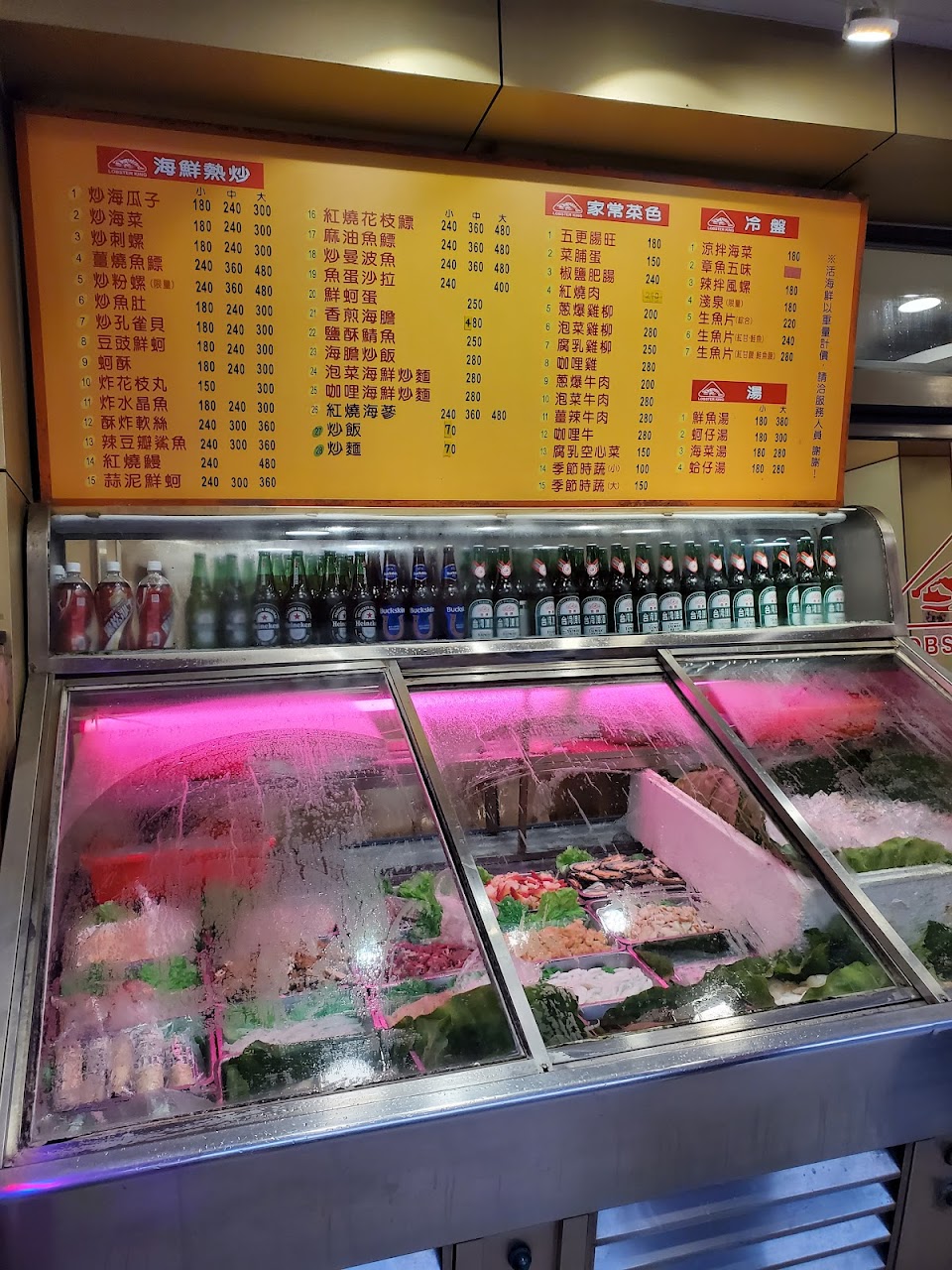 大部分快炒菜單牆上都有價格,海鮮時價部分詢問也會先告知。燙活蝦約380,炒海瓜子約180,五顆乾煎九孔沾五味醬35 ,一個人也吃的很開心。口味不錯,小老闆親切態度跟阿姨們的服務其實也很好啊!