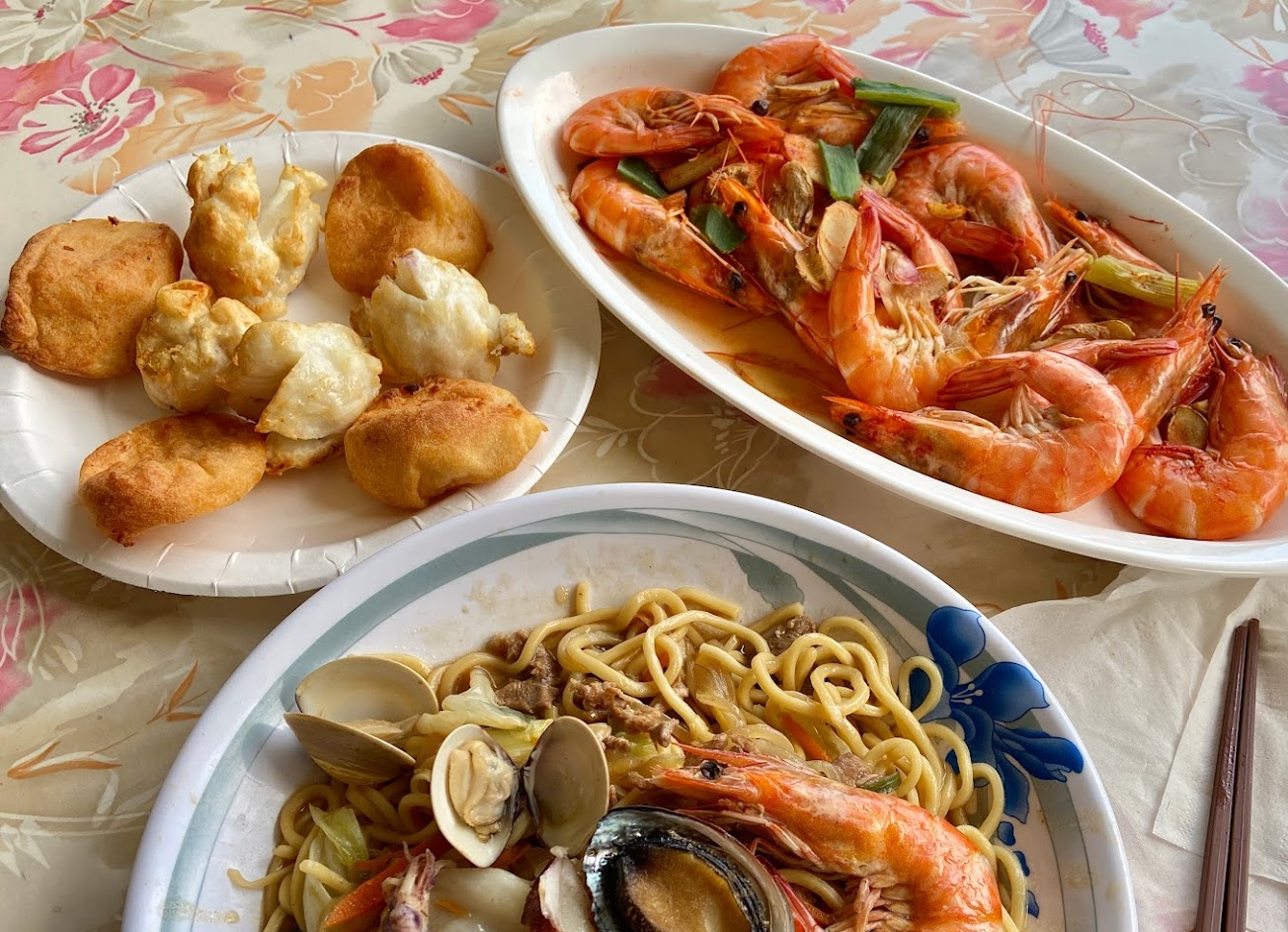推薦白蝦、花枝丸、海鮮炒麵、蒜香九孔