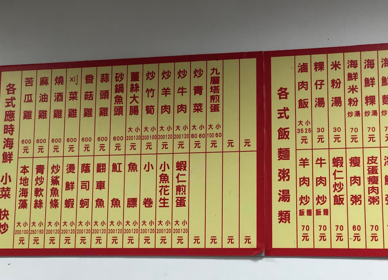 推薦:炒小卷、清炒軟絲、蝦仁煎蛋、本地海藻(會黏稠稠的)、香煎白帶魚(有點貴但很好吃)、海鮮米粉