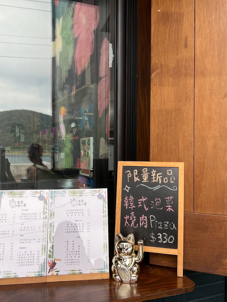 這裡有好喝的手搖飲 另外推薦起司番茄肉醬熱狗堡 配上舒服的海景