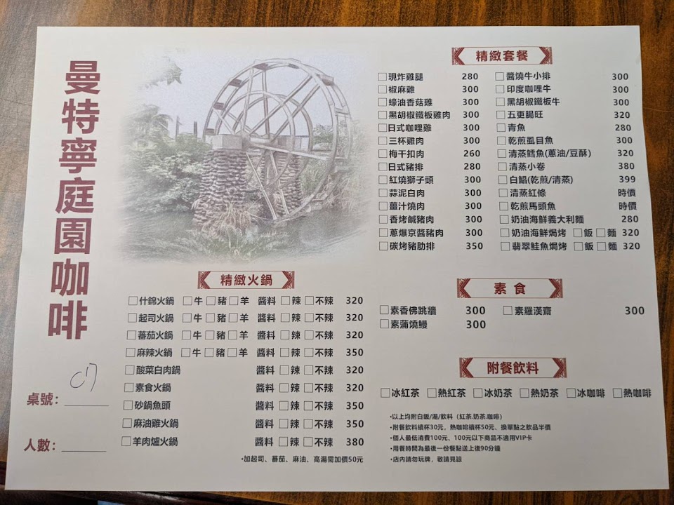 曼特寧庭園咖啡餐廳位於金山往陽明山路口旁,場地寬廣,價廉物美,泡湯後肚子餓的人可至此供補充體力,該店營業時間至零晨3點,室內有眾多木雕藝術品,供有興趣的朋友觀賞。