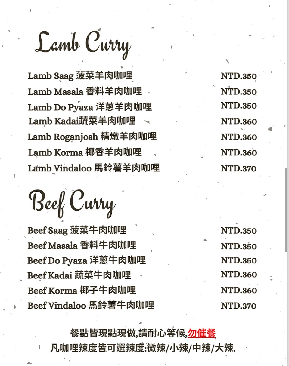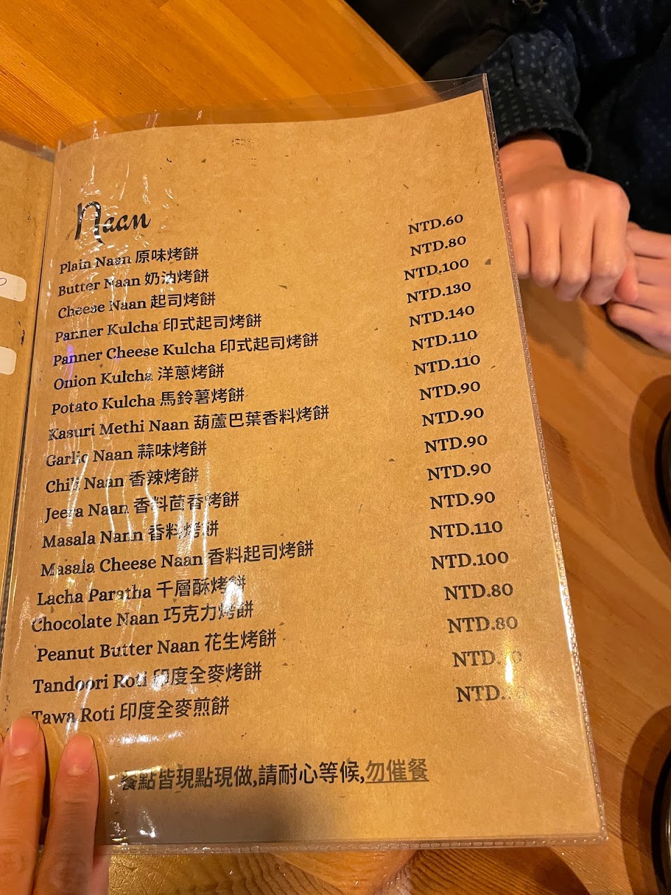 點了菠菜雞肉咖喱、香料羊肉咖喱、茴香烤餅、印式起司烤餅、印式沙拉,餐點很好吃,富有濃郁的香氣,週末老闆有招待一小杯威士忌,店員也很親切會介紹餐點,很棒的餐廳,值得再回訪!