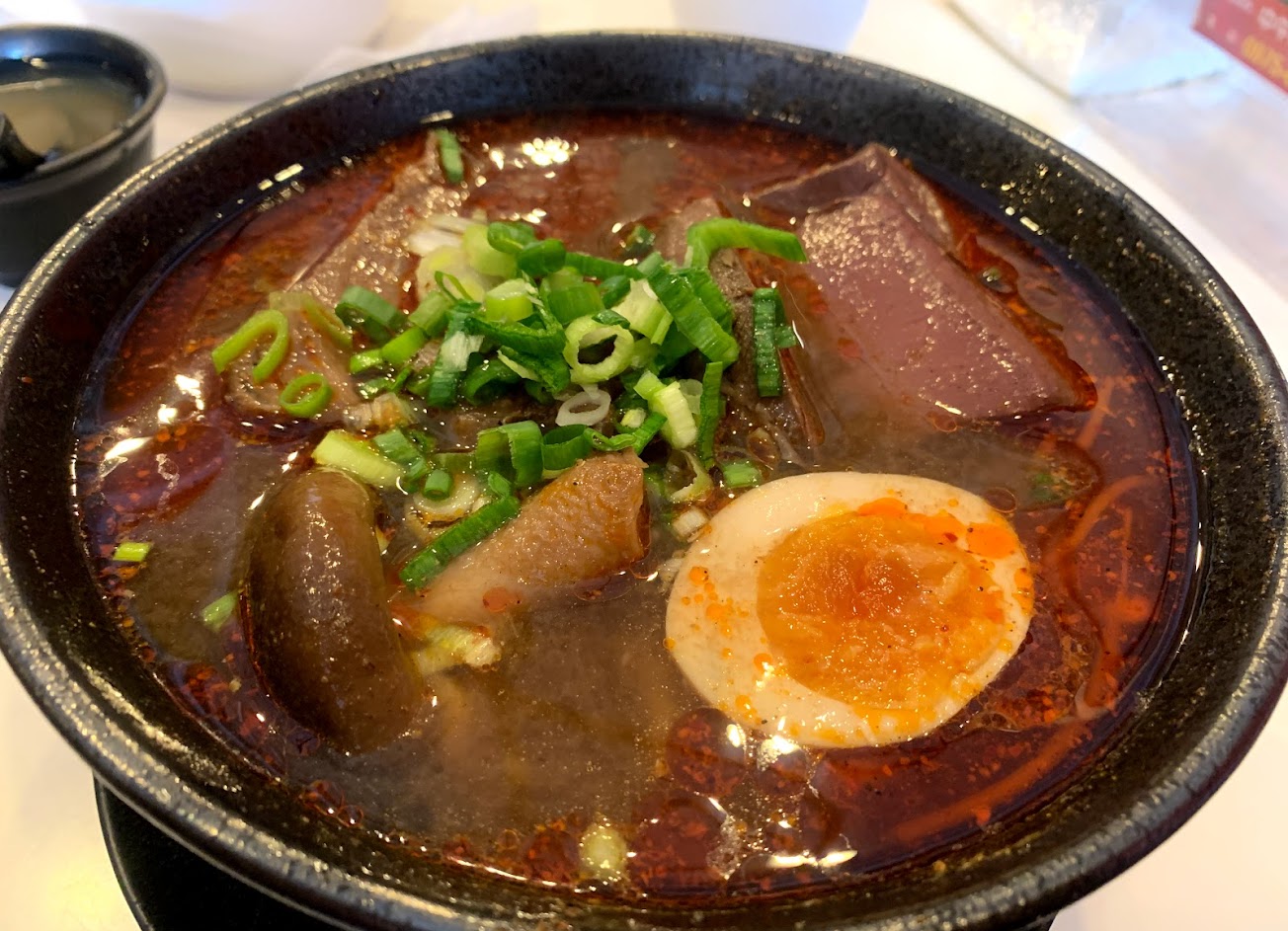 而就湯的部分,加入的鴨血、溏心蛋、香菇、黃豆芽,還滿特別的,湯頭也比較像是麻辣燙、麻辣鍋的那種。辣味有很多種,而這碗湯頭某種較嗆辣的味道會稍微突出,個人覺得辣味要能很溫順的融入湯頭的其他味道中,有辣度但不會搶戲才是最好的。建議除了嗆辣能稍微減少外,麻度稍嫌不夠,可以再多加些麻辣。除了上開希望好還要更好的小小的建議外,基本上湯頭香、底蘊還不錯。