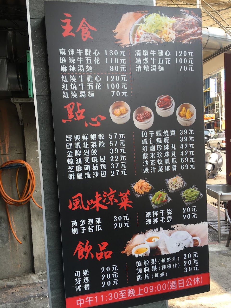風味涼菜與港式點心可口,主食肉有牛五花,牛腱心,肥腸等,湯頭有清燉,紅燒,麻辣三種口味供選擇,麵條有拉麵及刀削麵兩種另有泡飯,現在夏天又提供免費綠豆湯消暑,點主食一份送一張免費風味涼菜券,真是物超所值。