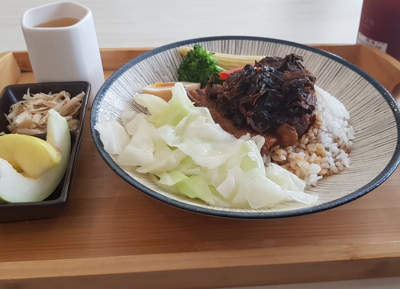 然後 然後 然後 她就把我男友的托盤直接收走了!重點是他根本還沒吃完啊 旁邊的堅果 跟蘋果醋都還沒吃完!就被收走了?