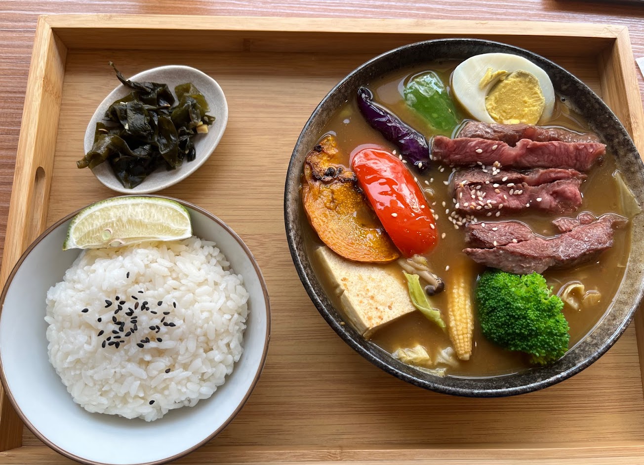 難得到內壢,發現這邊居然有一家北海道湯咖哩,於是就來吃了,我覺得湯咖哩的料很豐富,有百頁豆腐、杏鮑菇、馬鈴薯、高麗菜、茄子等多樣的蔬果,咖喱味道適中(因為是湯咖哩,咖哩味不會太濃郁),牛排很鮮嫩,我很喜歡這家的牛排。