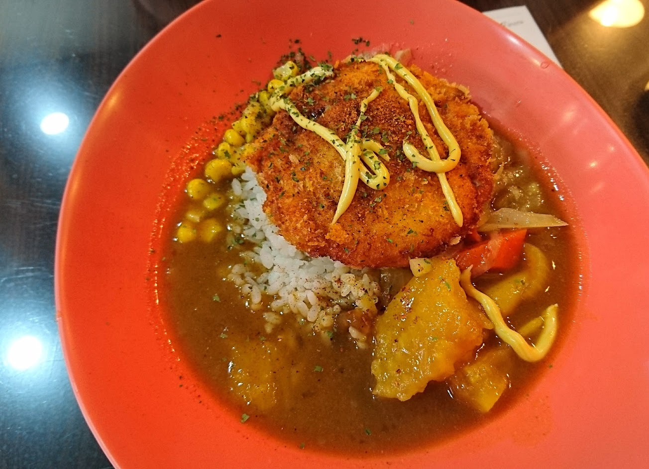 今日點了咖哩豬排飯,咖哩醬味道甜香很好吃,炸豬排淋上了蜂蜜芥末醬非常搭配,可惜炸豬排外衣有點太硬了,口感上比較可惜。