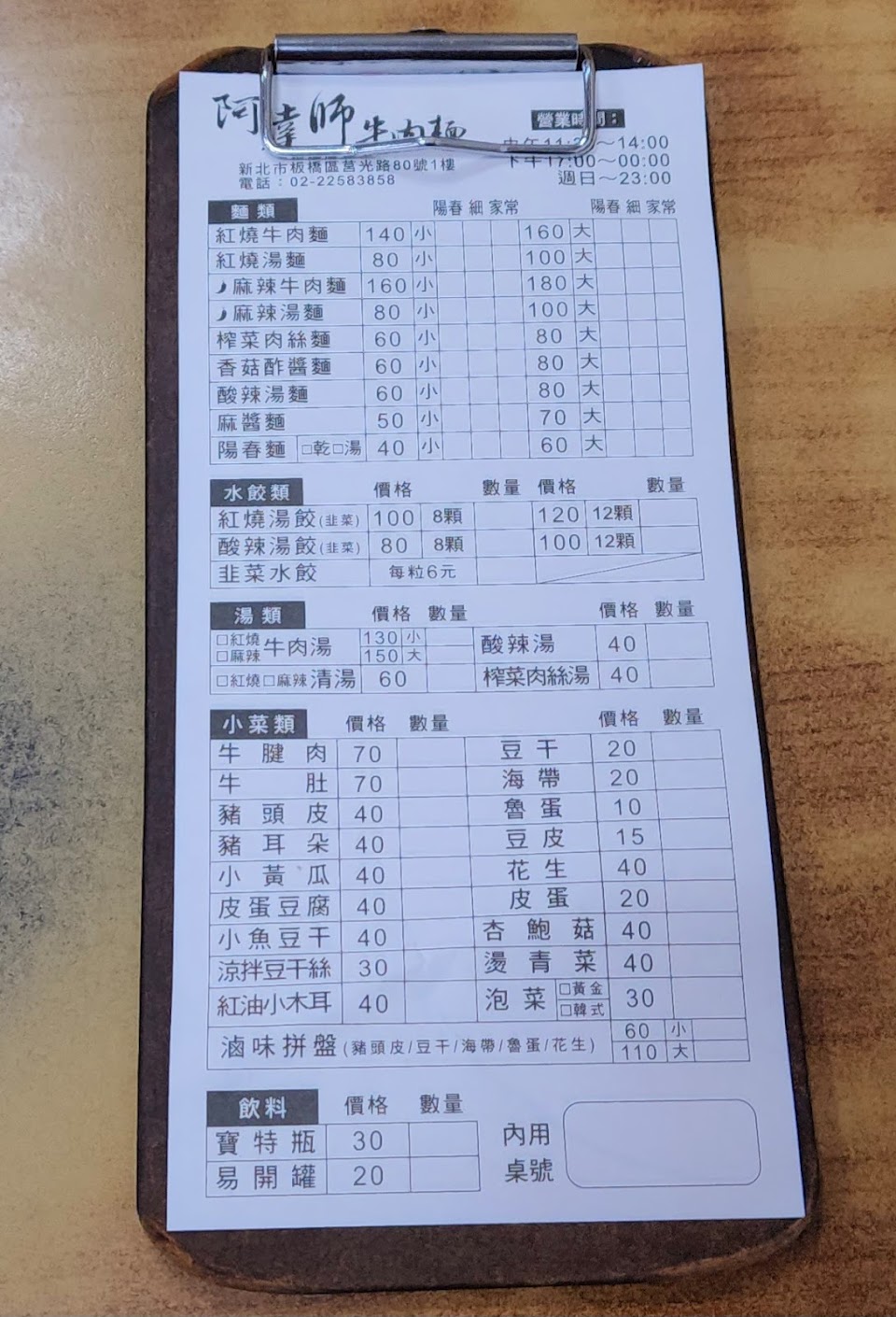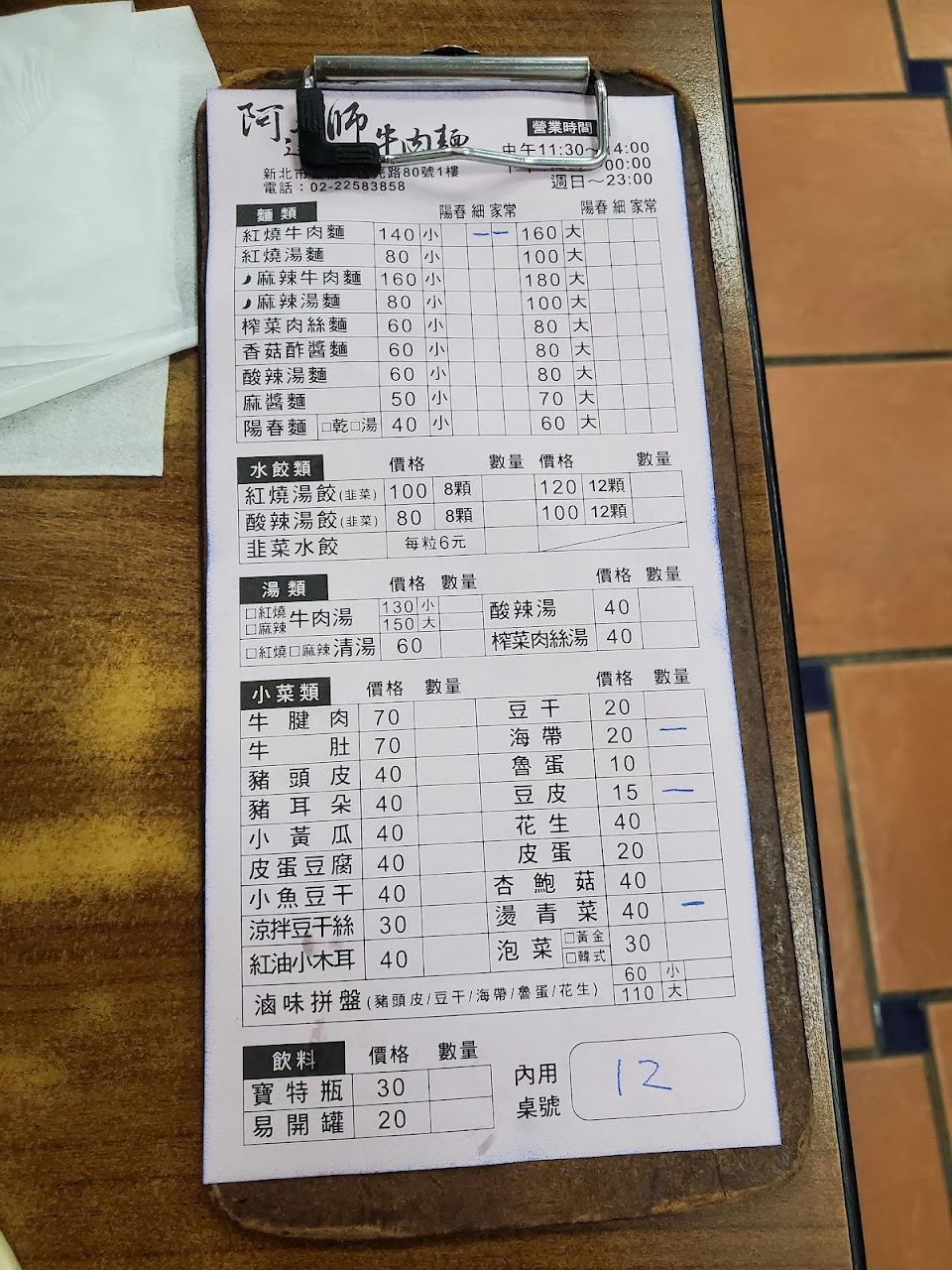 每次用餐時間經過都是大爆滿,菜單分成外帶黃色和內用白色,如果櫃檯有人就請他協助帶位,沒人就自己拿白色菜單找位子,內用點好餐就直接拿到裡面給店員,吃飽才結帳。牛肉麵小碗140,可選由陽春,細麵和家常麵選一款。湯頭味道還不錯,牛肉軟而不爛,稍微需要咬一下。選擇的家常麵很巴湯,口感不錯。滷味拼盤小的$65,裡面有豆干,海帶,滷蛋,花生和豬頭皮,價格很實在。韭菜水餃一顆$6,內餡韭菜不多,似乎有混一點高麗菜,有脆脆的感覺,口味上比較家常。