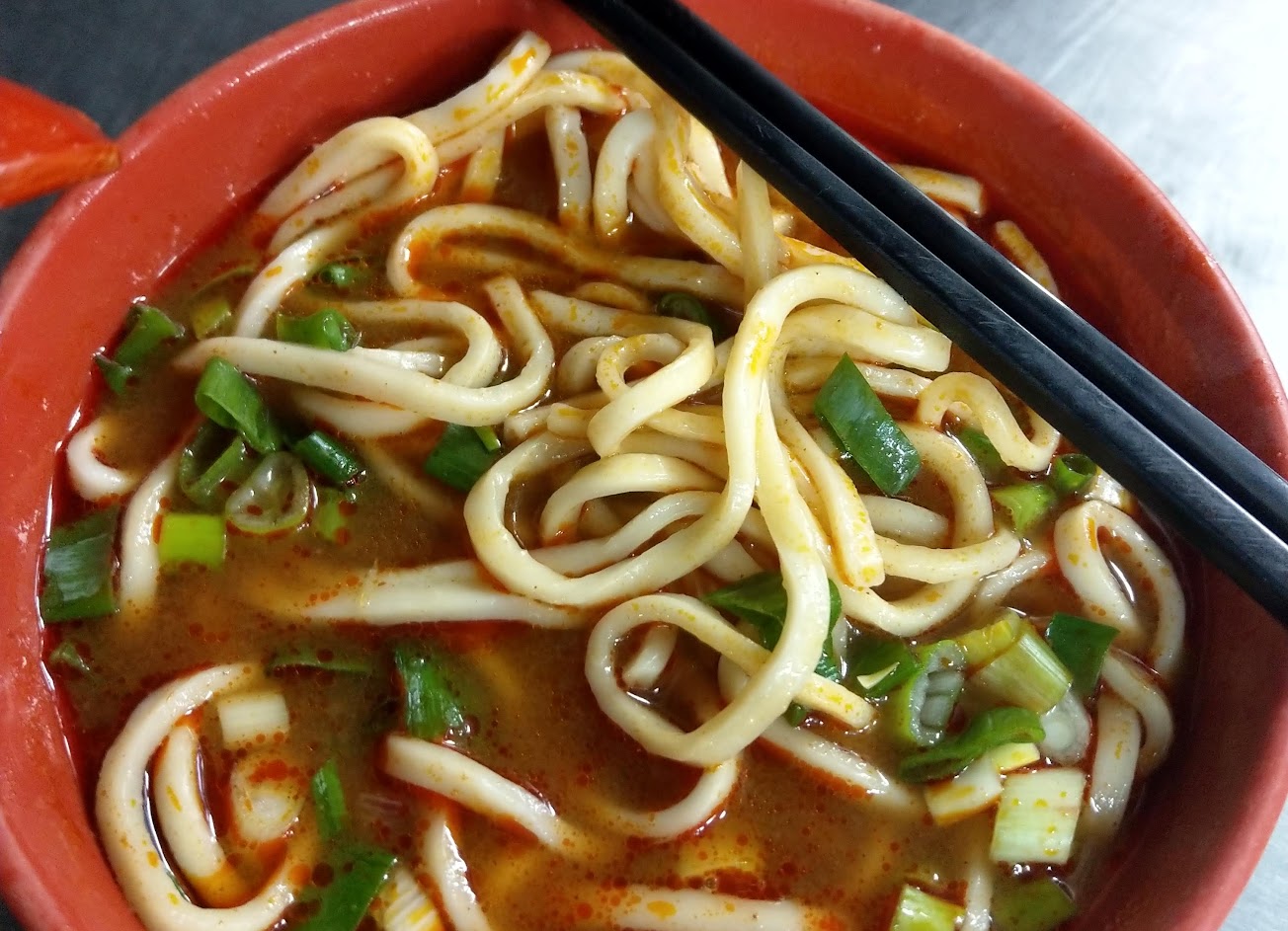接下來泡飯上來了,因為我喜歡吃細面,而店裡只供應粗麵,所以點的是泡飯,我沒加辣,但它湯底就有一點辣了,辣度是如果不敢吃辣的人最好先讓同行的人點後試吃,再決定要不要挑戰,我個人是還蠻享受的,而且我喜歡吃蔥,蔥跟辣的味道很配,他蔥也給很多,牛肉剛好半筋半肉,不知道是剛好還是特別配置過,肉不會太乾也沒特別嫩,剛剛好,值得改天回頭再吃,份量偏多,很好。