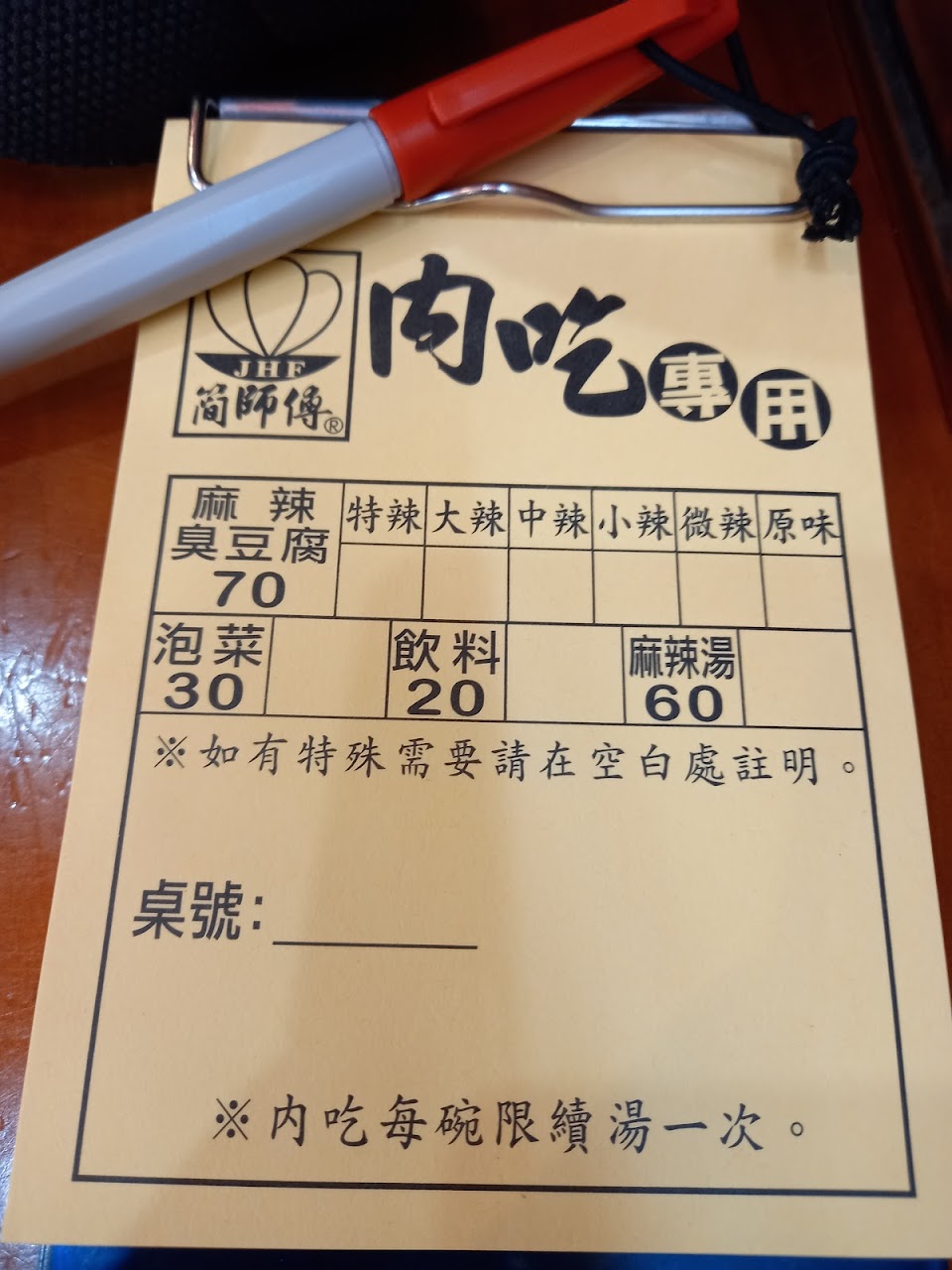 2020.03.07 內用要先跟櫃臺抽號碼牌,外帶可直接跟櫃臺點餐。內用外帶的人都非常多,不過販售的菜單項目簡單,所以翻桌速度也非常快,雖然門口總是一堆人在排隊,但不會等很久。內用約共13桌,但座位很小且擠,人多時就會很熱,外帶回家吃比較輕鬆。 菜單只有四樣:麻辣臭豆腐70元、麻辣湯60元、泡菜30元、飲料20元,辣度除了原味外,還有微辣、小辣、中辣、大辣、特辣這五種可以選,建議從微辣開始試,如果太辣可以配偏酸的泡菜來解個辣。 麻辣臭豆腐一碗有2大塊臭豆腐,臭豆腐很入味,上面還加了點肉燥搭配;小辣比起微辣的湯,喝起來更鹹、口味更重。內用可以加一次湯,加湯也可以選辣度,建議不要吃到快完才加湯,因為加的湯很熱,太燙還要等涼一些才吃得下去。