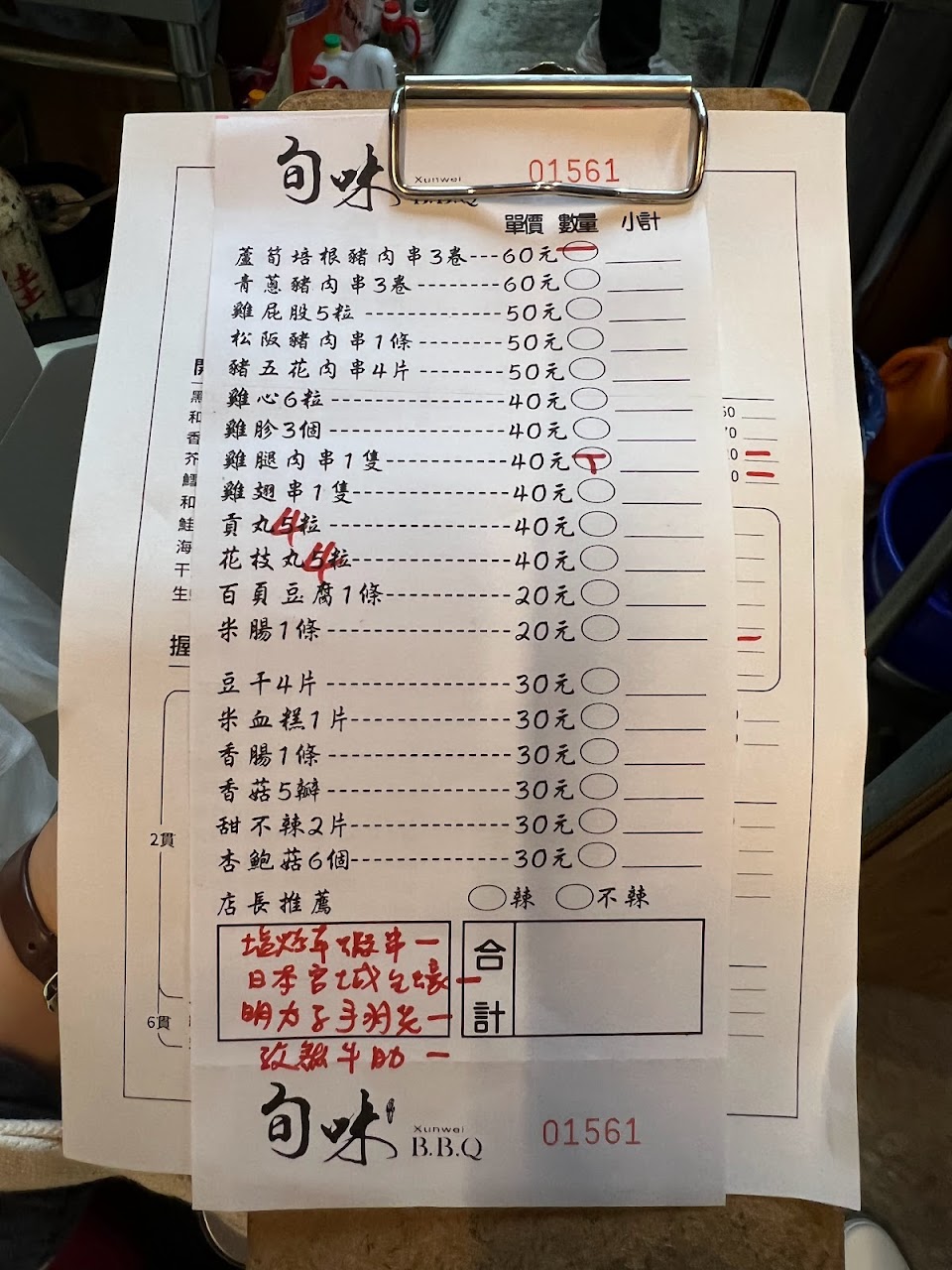 同時點的蔥肉串、蘆筍肉串、牛肉串、豬五花隔了快一小時才送來
