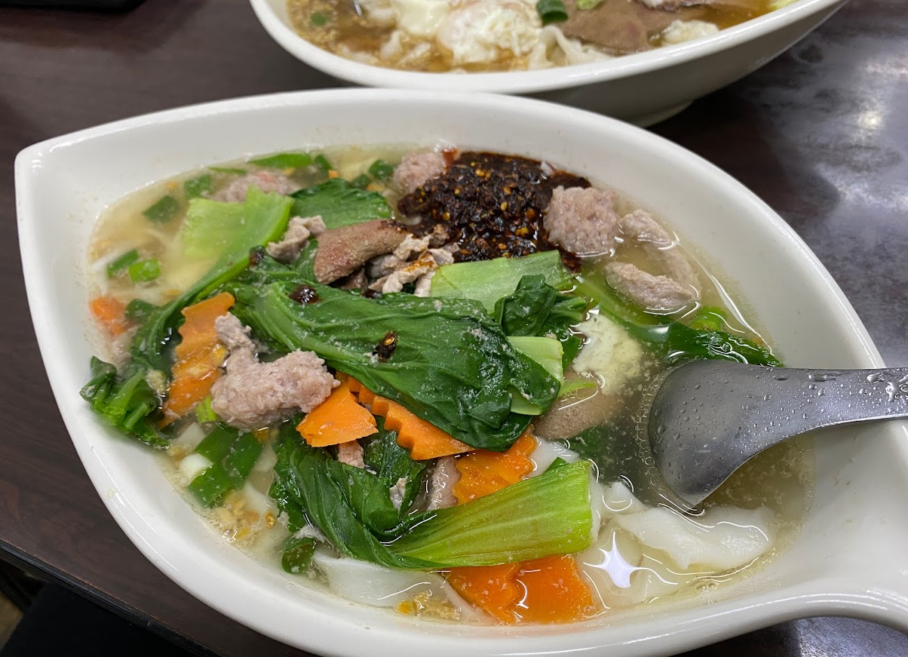 雞窩湯米干。 對我來說,湯頭較為簡單而不混雜。 肉類澆頭有豬肉絲,豬肝,以及偶爾吃得到蝦肉的肉丸。 蔬菜量非常多,味道也比較均衡。 個人喜歡把辣椒渣從辣油中稍微濾出再加入湯裡。除了可以增加香氣與味道,還不會過於油膩。 只是味精多了一點,但這樣的平價美食,就別太在意了。