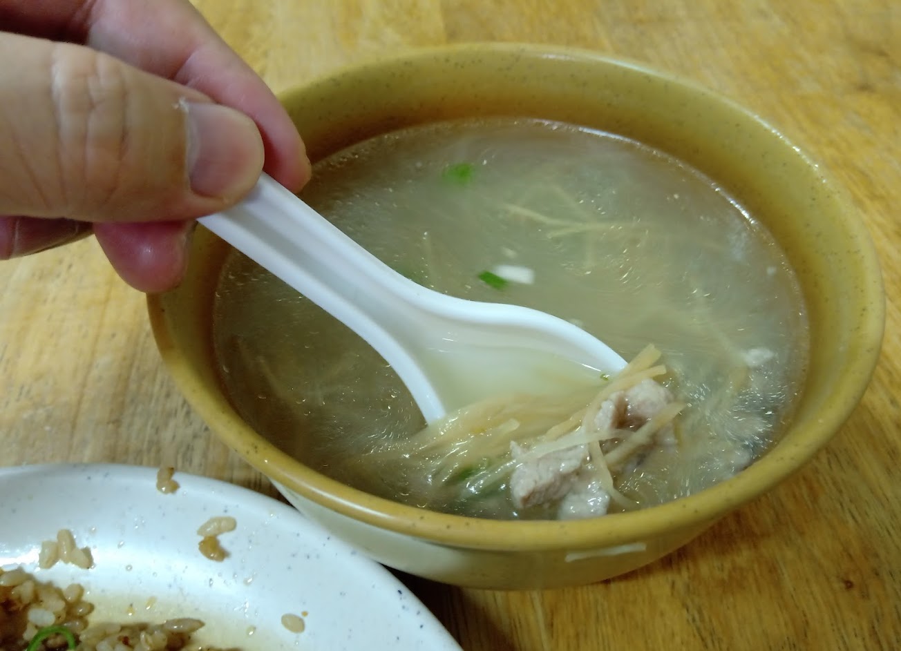 薑絲肉片湯,薑絲很多、肉絲是點綴用的,但湯頭好,才台幣30元還現煮,可以。