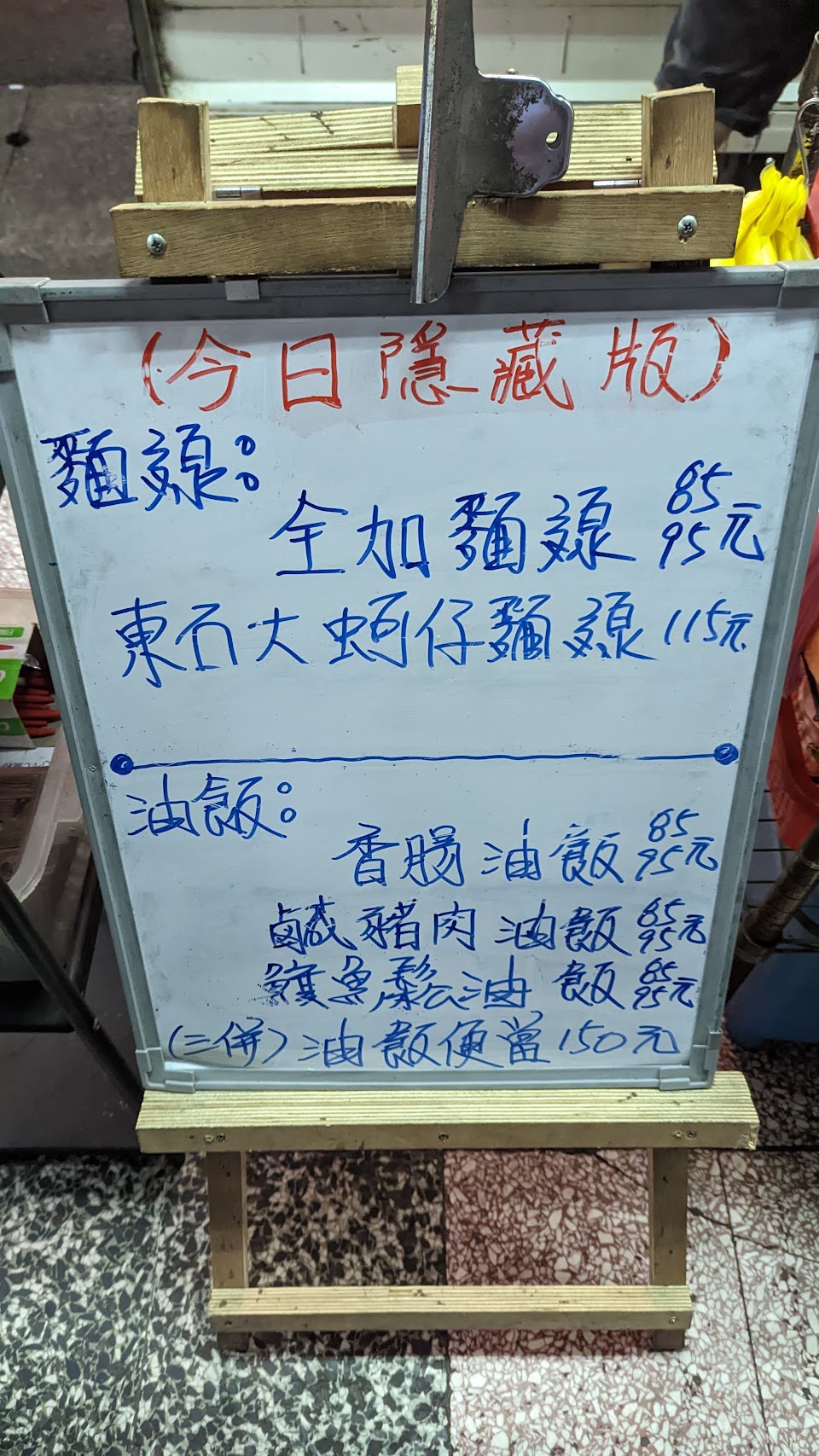 隱藏版麵線, 大腸蚵仔麵線, 炸肥腸麵線 蚵仔麵線 綜合魚丸湯 溏心蛋, 隱藏版三拼油飯, 鹹豬肉油飯