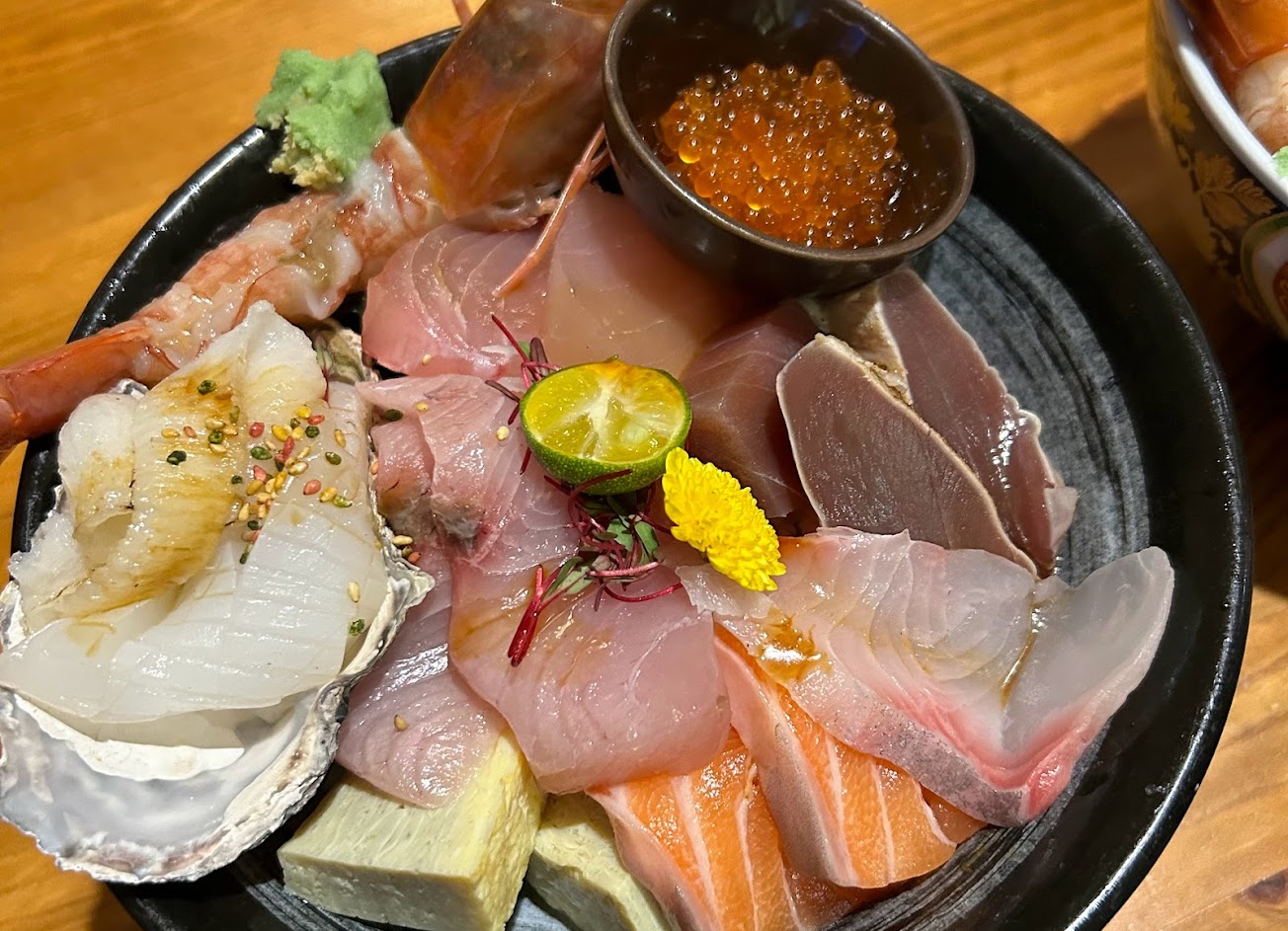 菜單豐富多樣,我們選擇單點的,點了2個丼飯,一盤上選生魚片,兩個茶碗蒸,兩碗味噌湯,4貫花枝壽司?,還有鯛魚下巴。