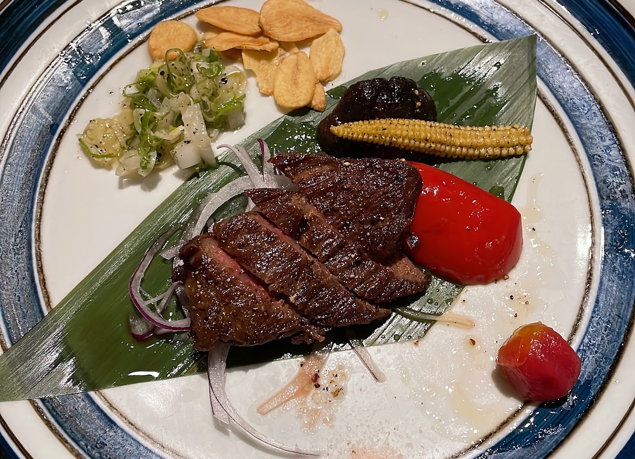第一次光臨選擇1080的套餐,前菜山藥泥加胡麻醬跟白芝麻及鮭魚卵酸酸甜甜的很開胃!吃一個太快沒有拍照。生魚片新鮮,可惜內場廚師兼服務生,太忙碌的他們沒什麼時間介紹餐點。三種生魚片+生食級干貝+紅蝦,蝦子沒處理好造成蝦身斷成兩半。握壽司也蠻不錯的,薑片也無地雷。熟食的部分第一道是煎烏魚,因魚本身有浸泡過味增所以甜度非常!烏魚本身也沒什麼魚刺,又香又甜超好吃!師傅上菜速度很快,桌上已經滿了三道菜,我們告知速度慢一點才先停止上菜,因為店內天花板的電風扇風很大,除了覺得冷之外,熱菜也非常快冷掉。再來是海鮮及蔬菜炸物,吃起來不油膩且爽口很推,有金針菇、香菇、南瓜、四季豆,因為本身不喜歡吃炸螃蟹所以就給別人吃了。主食上場是choice的牛肉,我們兩個人的肉口感不同,我老公的牛肉油脂太多但熟度剛好,我的牛肉因為部位比較薄,但他們煎的時間一樣,所以比較熟比較硬一點。雖然牛肉旁的配菜都不錯吃,但覺得主角沒掌握好太可惜。後面的魚湯只是普通的清湯加一些香菇,沒有海鮮味。水果甜點普通。若是要以1080來說的話CP值還可以,但吃到刁嘴的朋友應該是不會想在二次光臨。