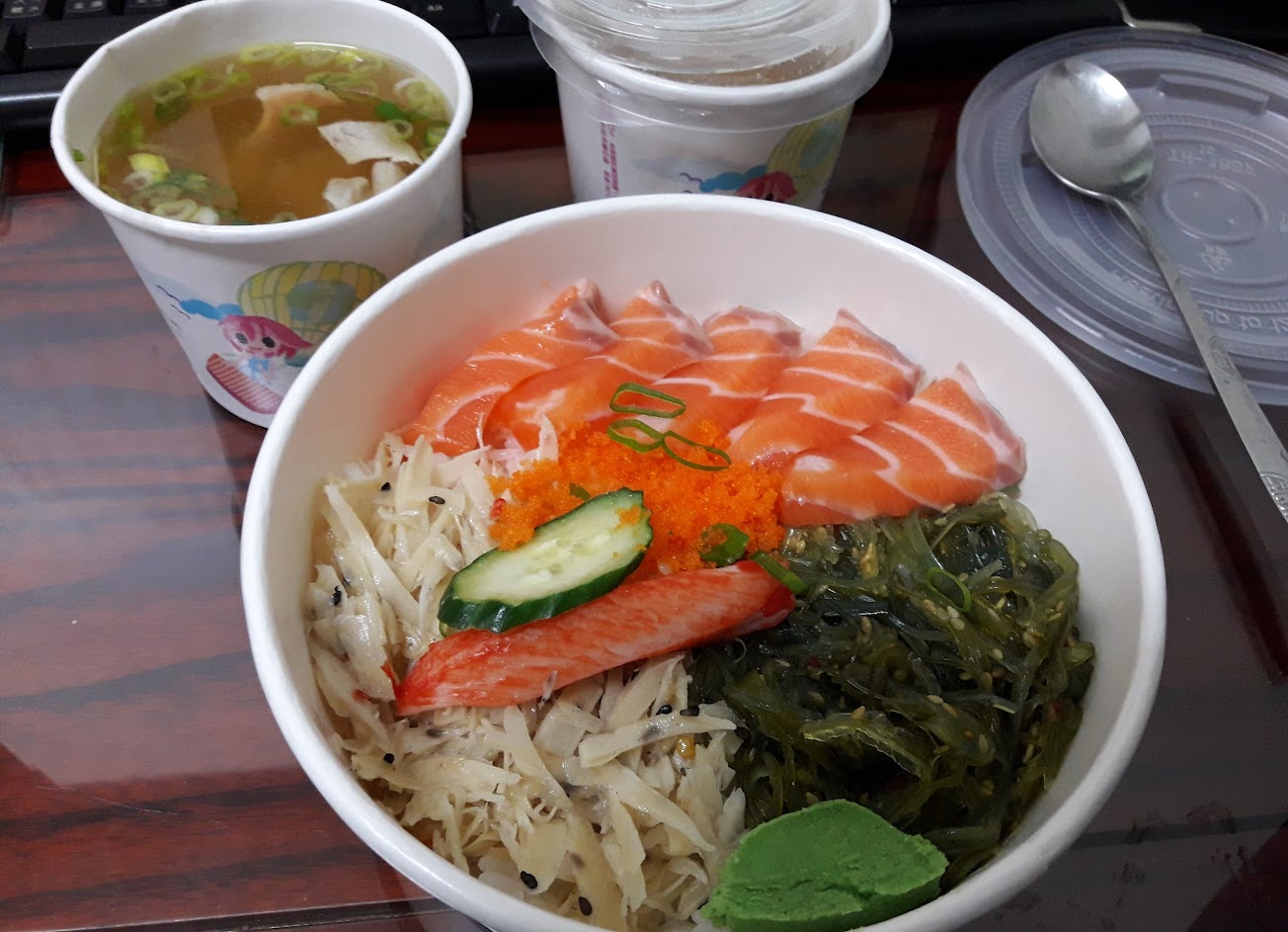 丼飯的醋飯跟配菜調味很開胃,但生魚片有腥味….。