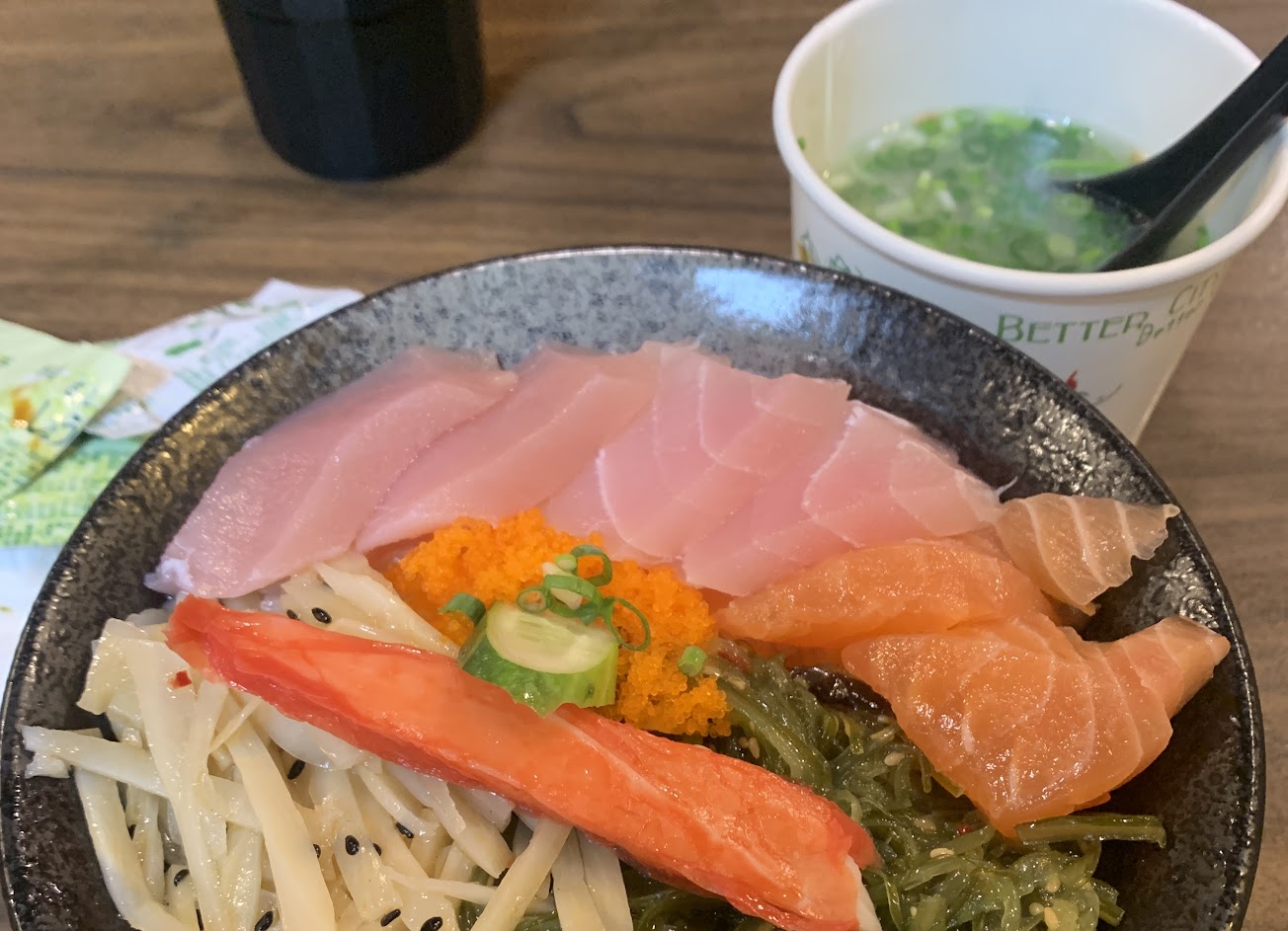 算是在這附近蠻特別的一間日式海鮮丼飯,不僅有飯吃到飽,又有鮭魚味噌湯喝到飽,甚至旁邊有一堆蔥可以自行取用,價格也算親民,可以說是CP值挺高的店,幸運的話,在鮭魚味噌湯裡面也可以撈到鮭魚~但很多刺,請小心食用