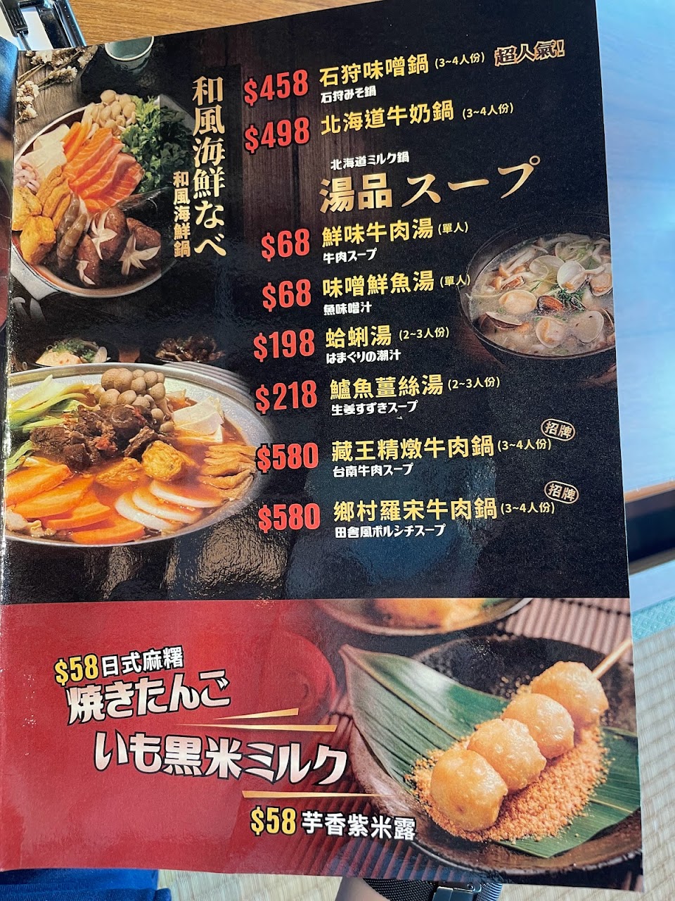 石狩味增鍋$458+10%:料就是照片第一層看到那些,下面都是白菜,湯頭不錯,料品質也很好。菜單寫3~4人份,但蝦只有2隻,兩人吃完沒問題。但是上桌後煮到滾至少等了15分鐘吧!!