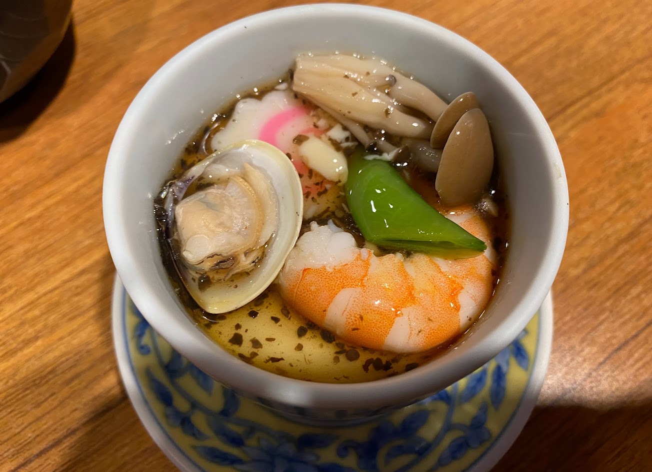 蒸蛋甜甜的,還有加上魚板、鴻喜菇等配料,值得點來吃