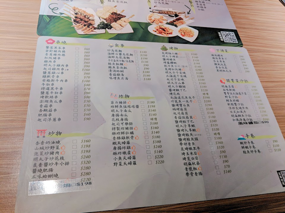 以價位論料理不值這價錢,價位偏高份量極小,沒有電子或行動支付,只收現金!平均一串100-300,非常小串,烤飯糰很乾又硬,明太子雞肉串烤焦又柴,剝皮辣椒牛吃起來像口香糖⋯^_^上2-3道菜後也無關心詢問是否添加茶水還收服務費?不會二訪謝謝