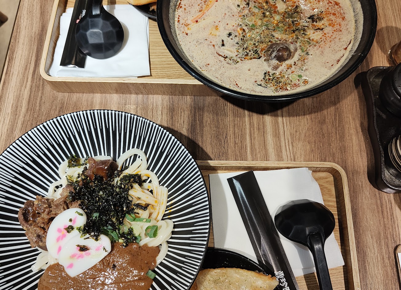 壽喜燒湯麵真的不推,湯頭味道有點進退兩難,吃不出來是不是一碗擔擔麵然後不小心打翻醬油進去,還是對於壽喜燒的理解有偏差,隔壁有本X可以去借鑒一下,如果是為了做出能夠喝的湯麵,那我認為是大可不必。
